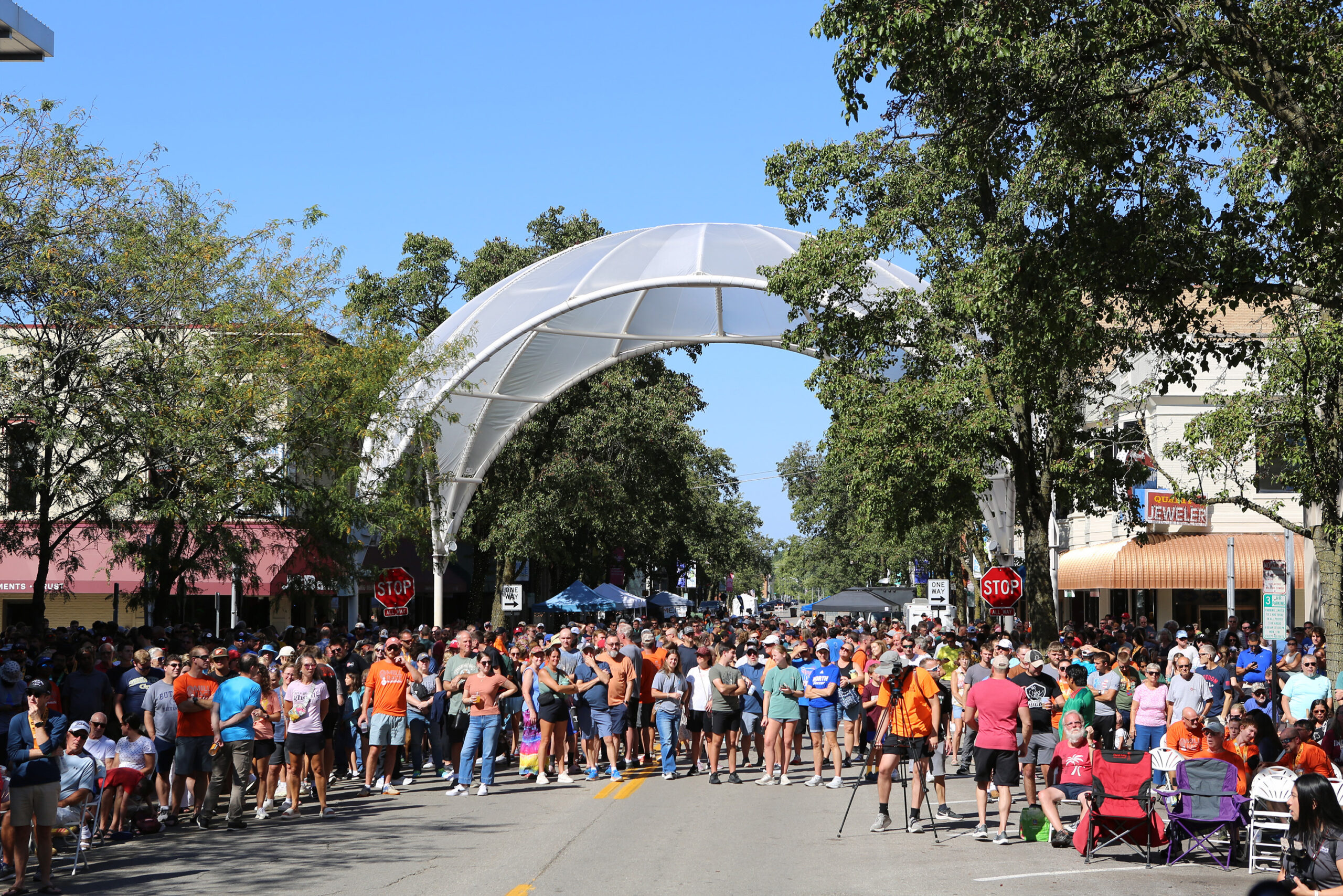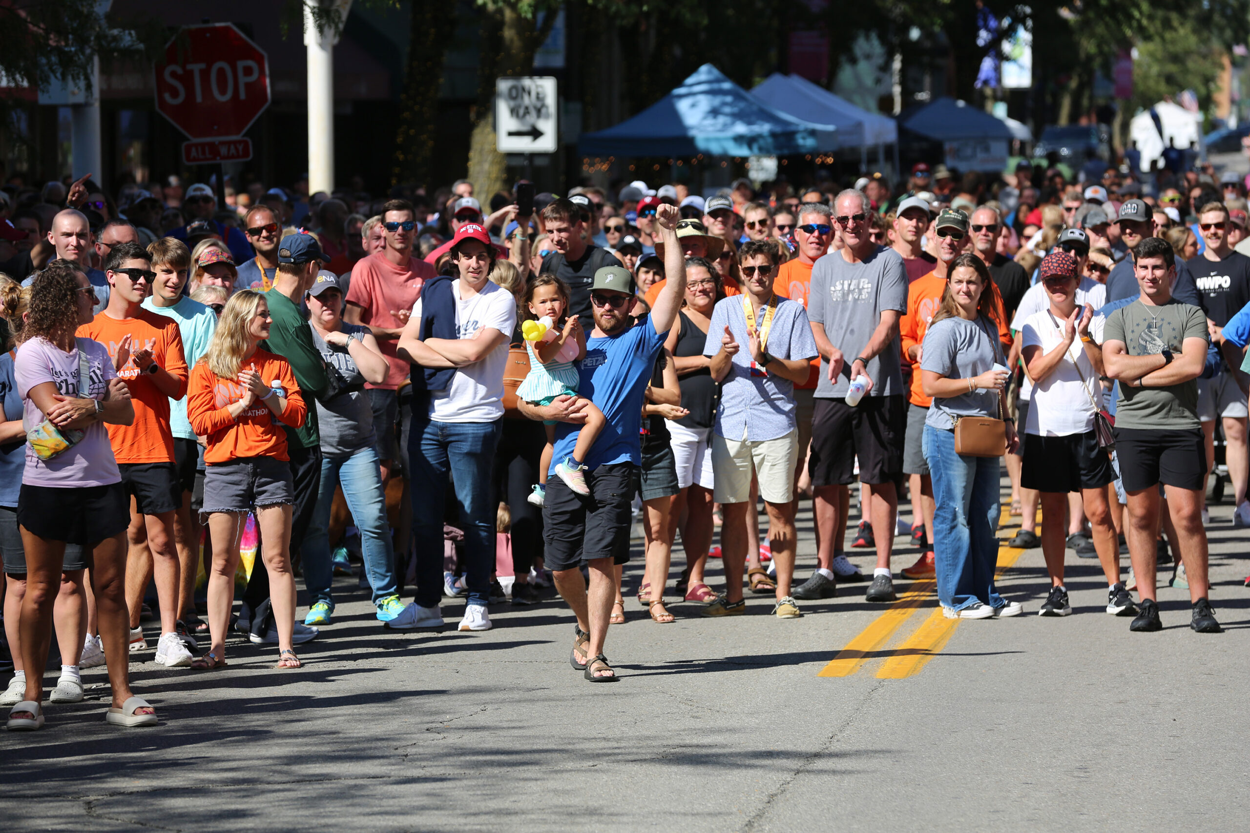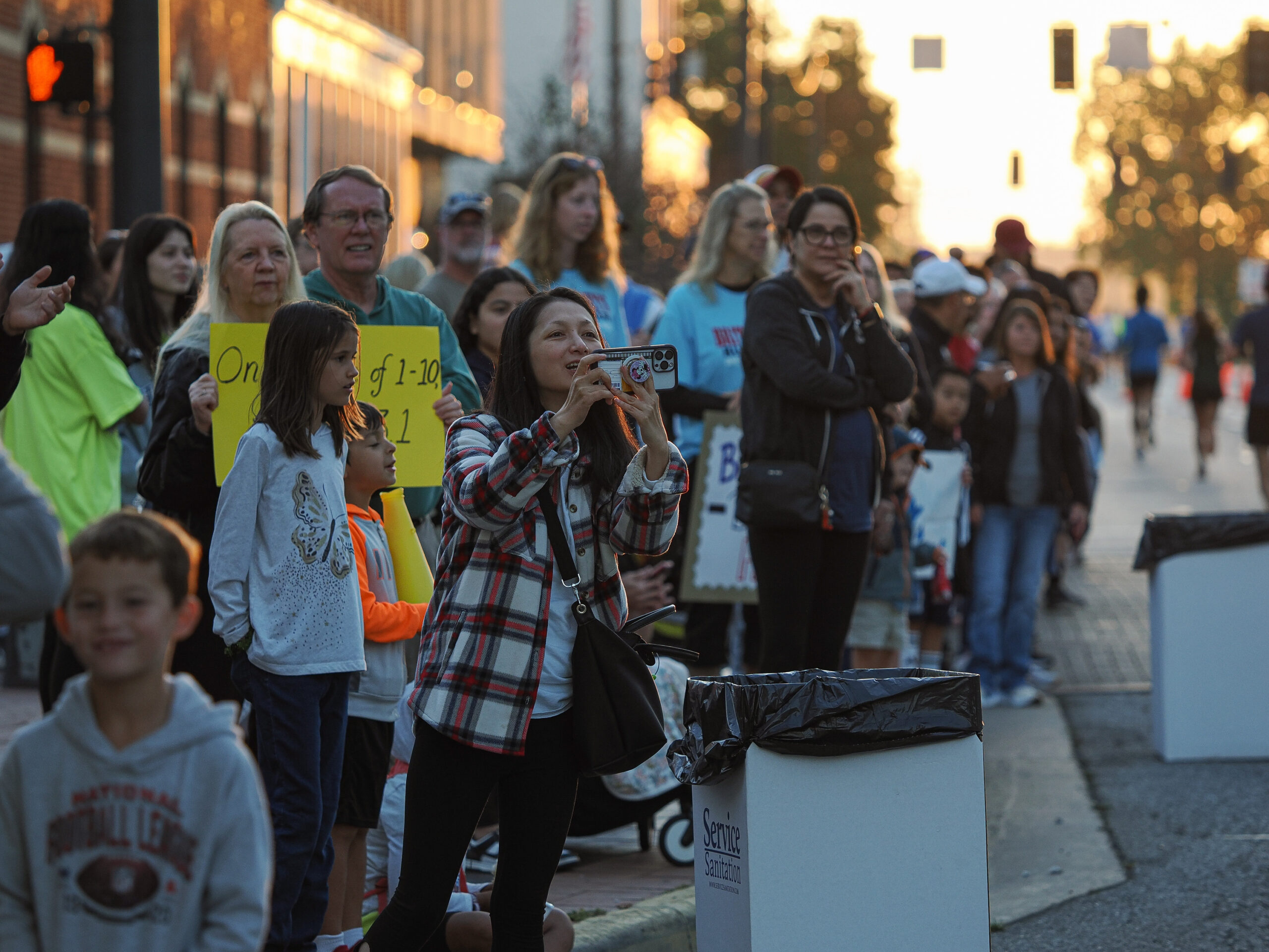People gather near the finish line for the Mill Race Marathon in downtown Columbus, Ind., Sept. 27, 2025.