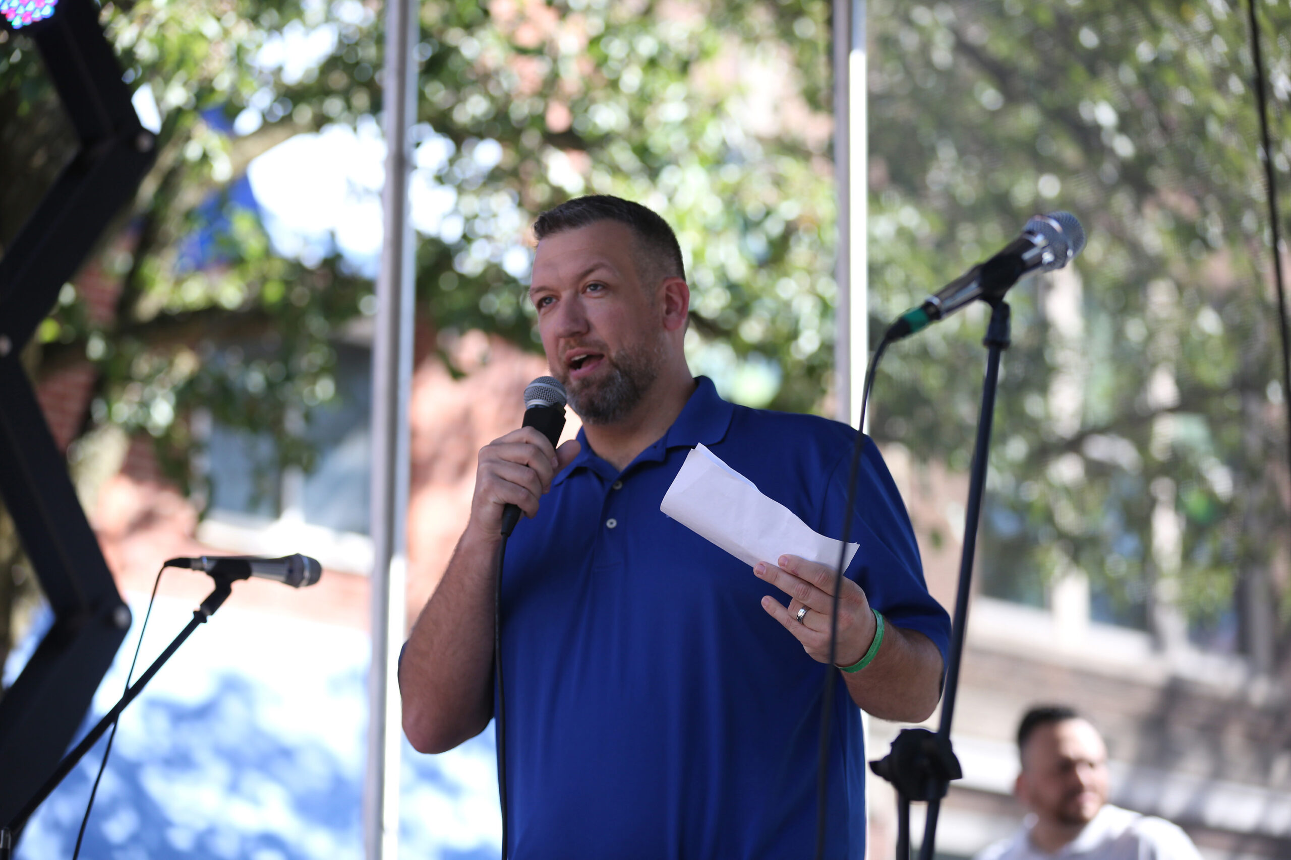 Josh Burnett, representing Johnson-Whitkemper, speaks at Finish on 4th before the drawing for a gas grill and a Dodge Ram truck during the Mill Race Marathon, Columbus, Ind., Saturday, September 27, 2025.