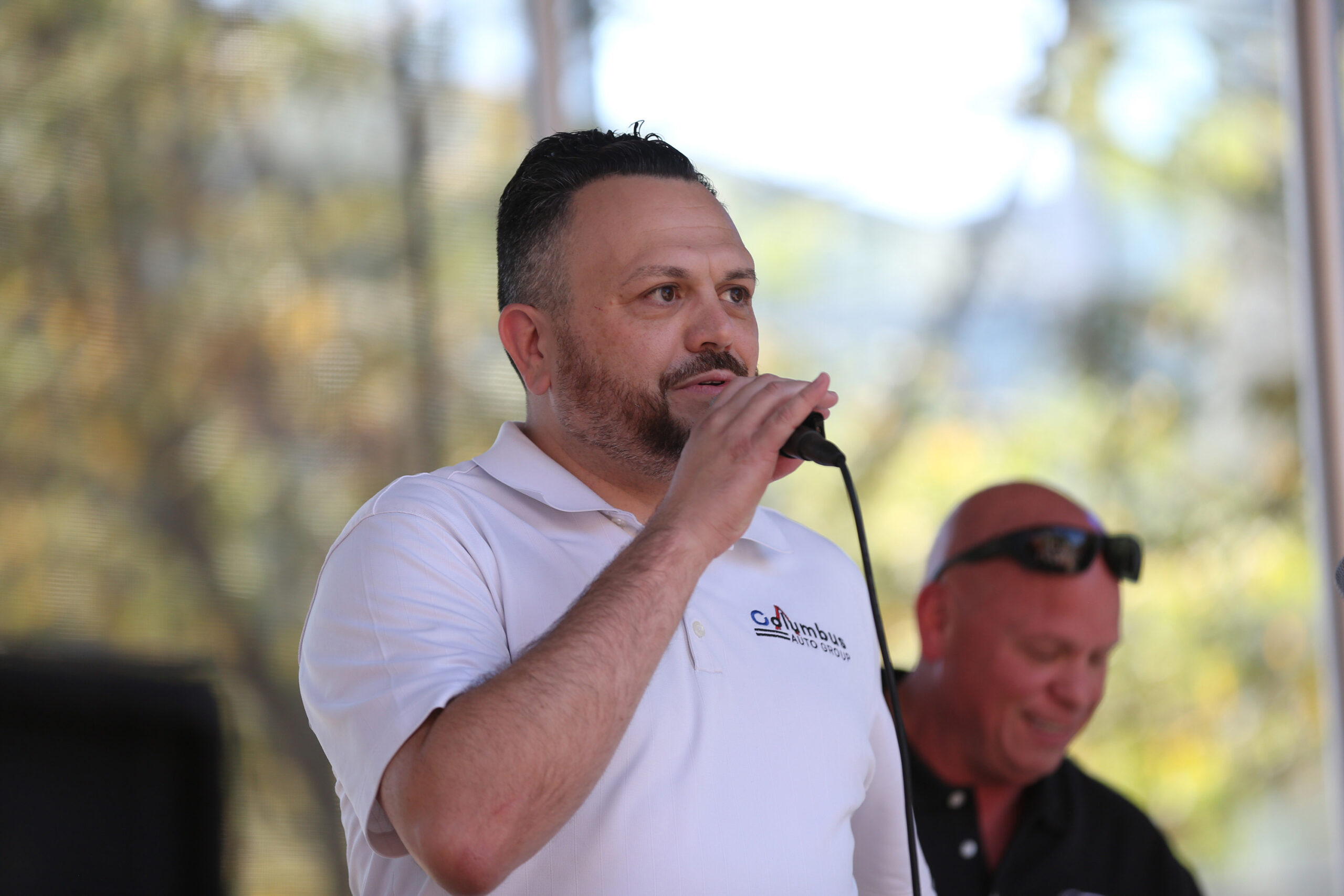 Leo Portaluppi, Columbus Auto Group, speaks during the drawing for Dodge Ram truck courtesy of Chrysler Dodge Jeep Ram of Columbus, at Finish on 4th during the Mill Race Marathon, Columbus, Ind., Saturday, September 27, 2025.