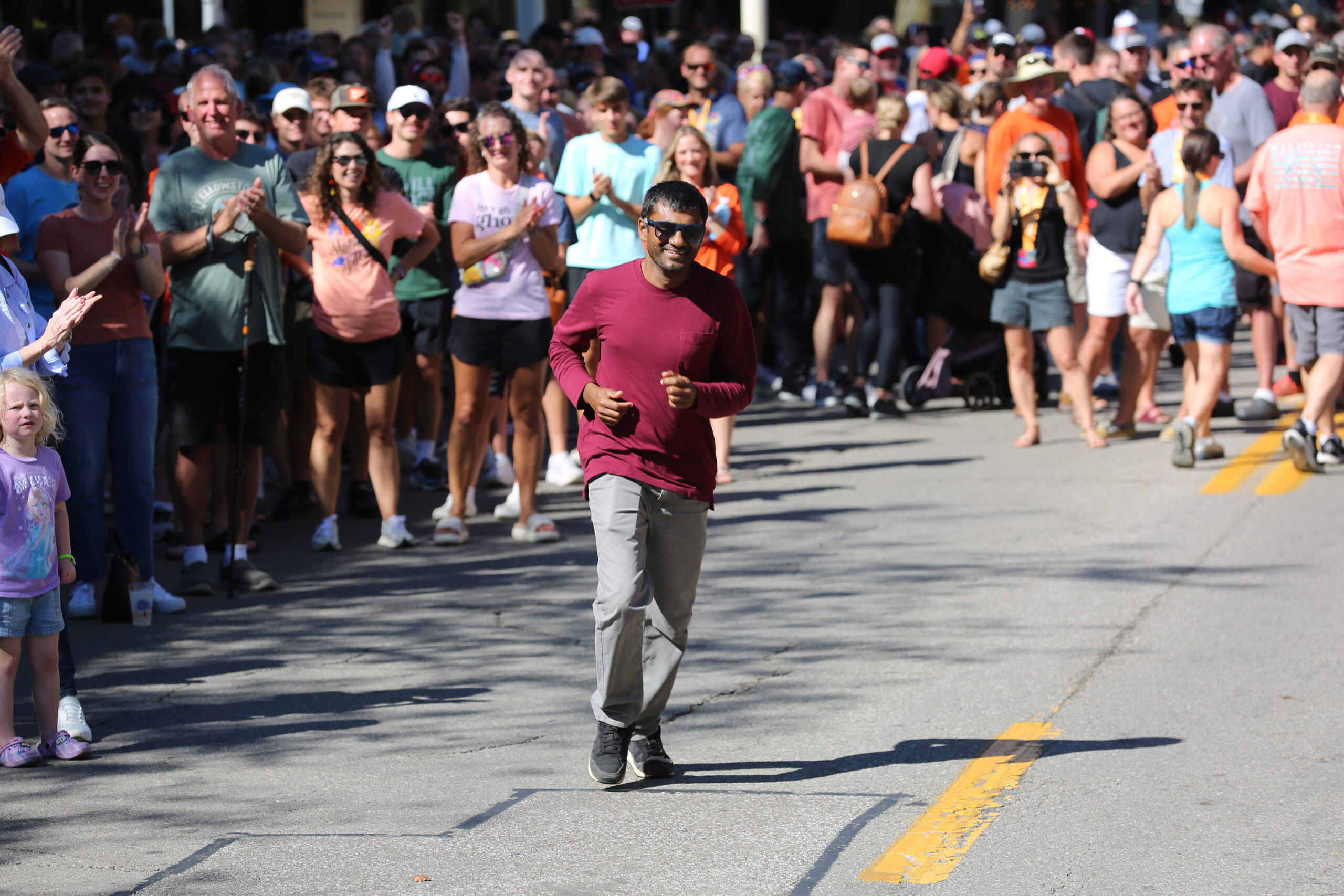 Dhananjay Awale, winner Dodge Ram truck courtesy of Chrysler Dodge Jeep Ram of Columbus, runs to the stage at Finish on 4th during the Mill Race Marathon, Columbus, Ind., Saturday, September 27, 2025.