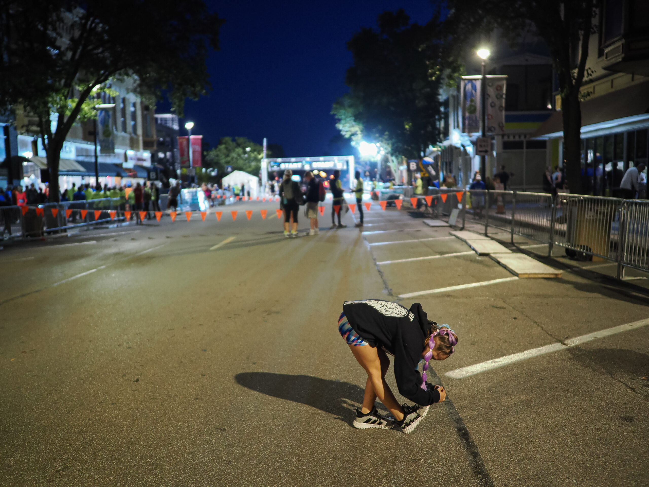 Kennedy Wheeler stretches before competing in the 5K portion of the Mill Race Marathon in downtown Columbus, Ind., Sept. 27, 2025.