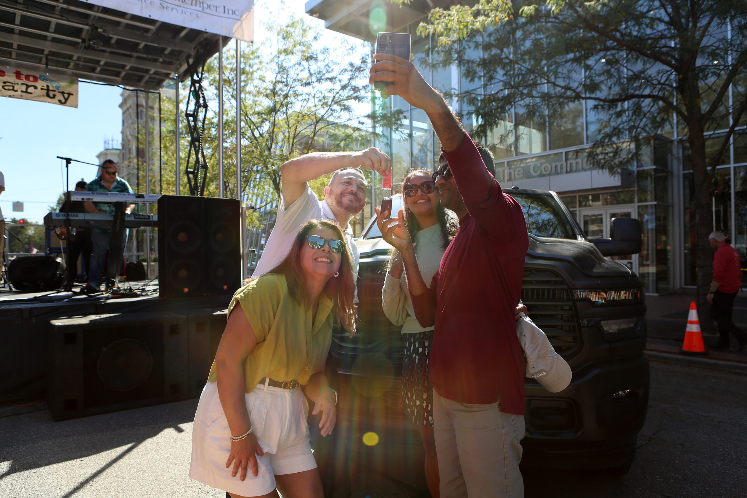 Leo Portaluppi, Columbus Auto Group, clockwise from back left, Prerna Awale, Dhananjay Awale, winner of the Dodge Ram truck courtesy of Chrysler Dodge Jeep Ram of Columbus, and Miriam Portaluppi pose for a selfie at the Finish on 4th during the Mill Race Marathon, Columbus, Ind., Saturday, September 27, 2025.