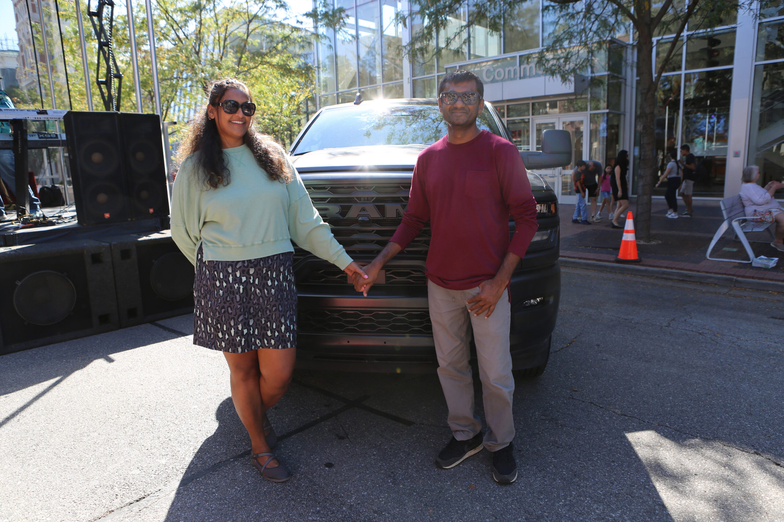 Prerna Awale, at left, poses for a photograph with Dhananjay Awale, winner Dodge Ram truck courtesy of Chrysler Dodge Jeep Ram of Columbus, at Finish on 4th during the Mill Race Marathon, Columbus, Ind., Saturday, September 27, 2025.
