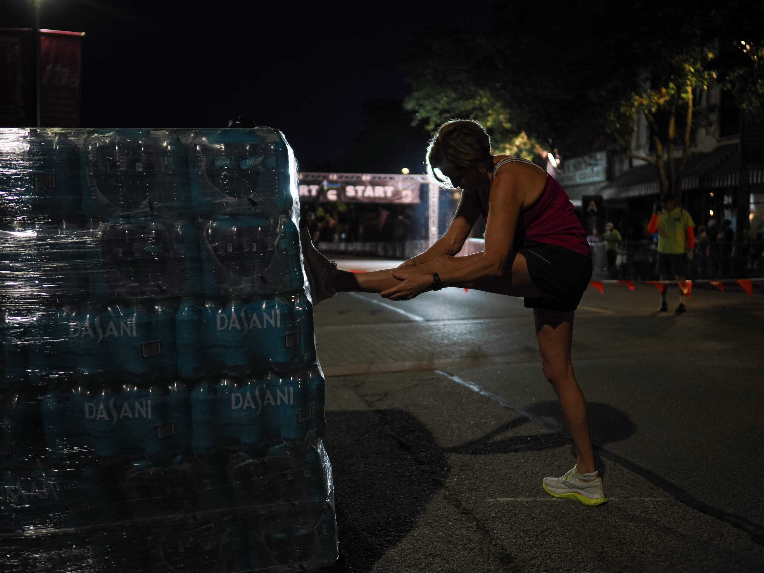 Stacy Stahl, of Greenwood, stretches before competing in the full marathon portion of the Mill Race Marathon in downtown Columbus, Ind., Sept. 27, 2025.