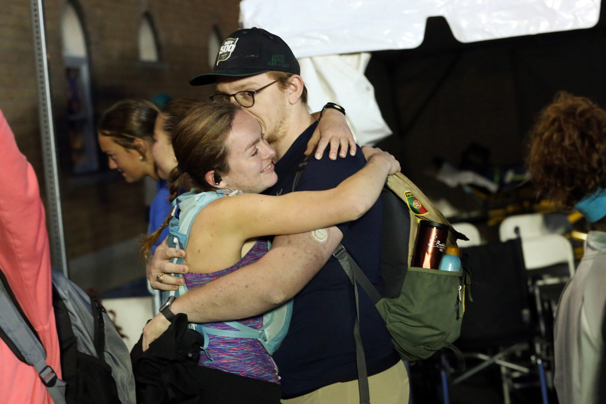 Rachel Brougher is hugged and wished good luck by Preston Saddler before the Mill Race Marathon, Columbus, Ind., Saturday, September 27, 2025