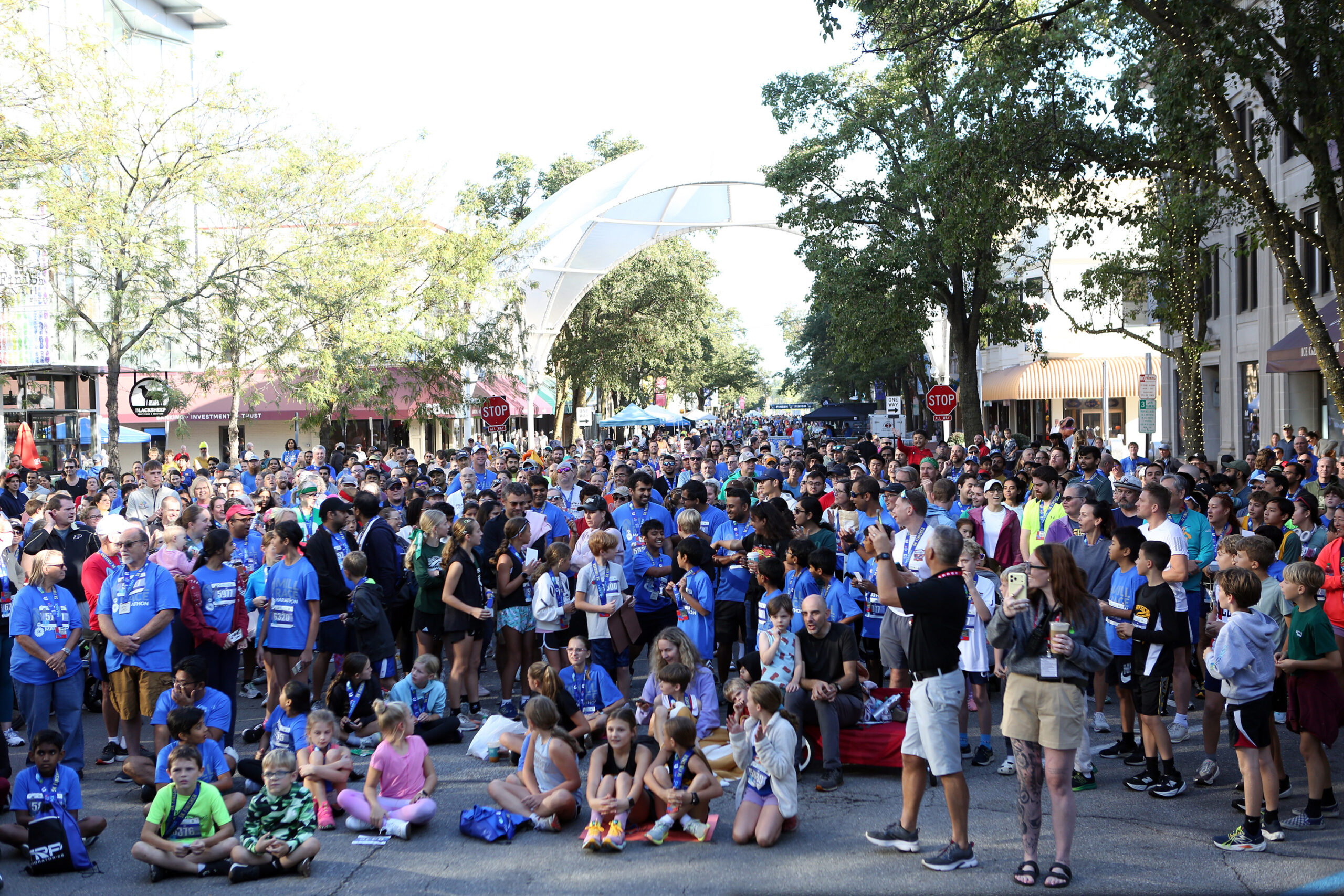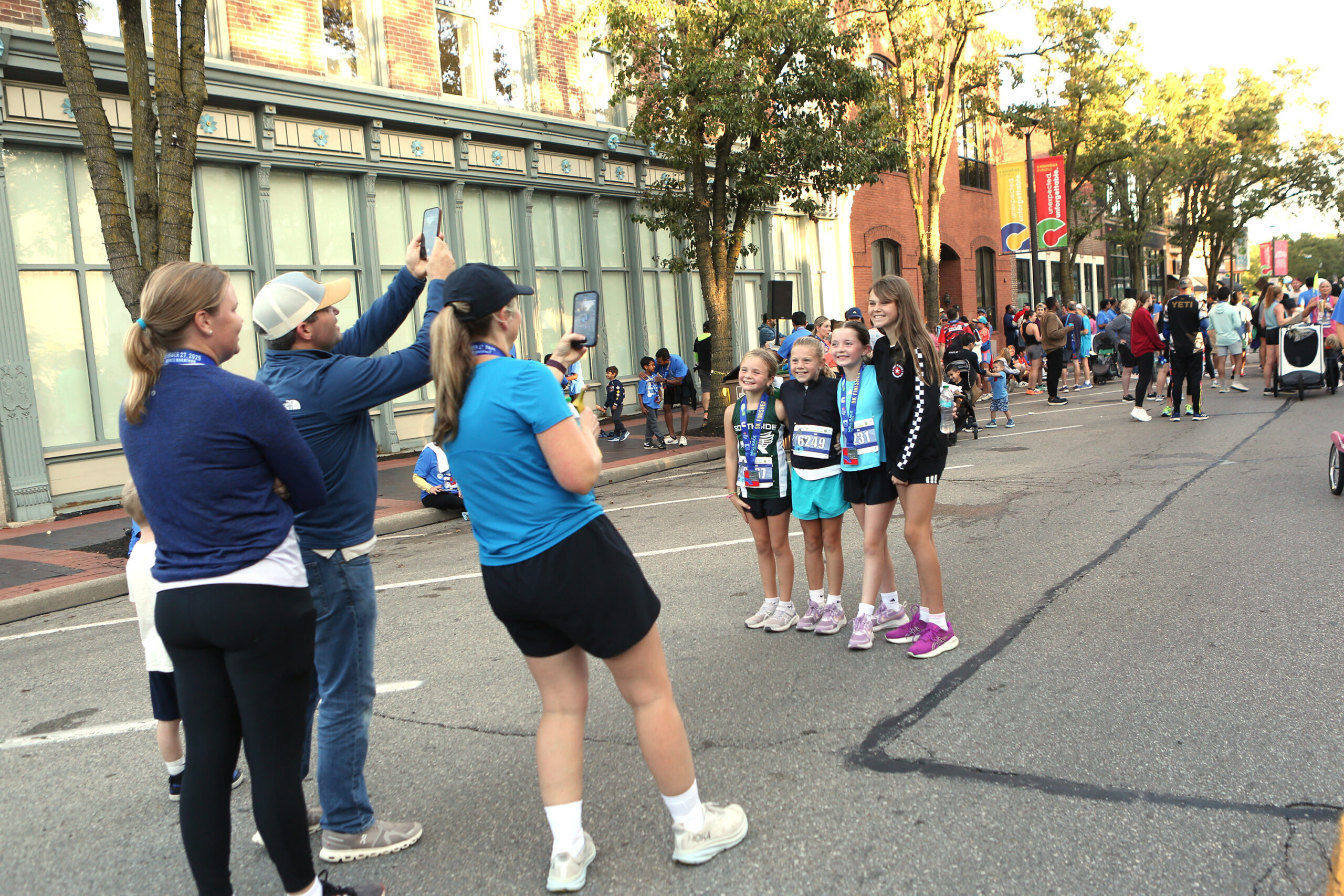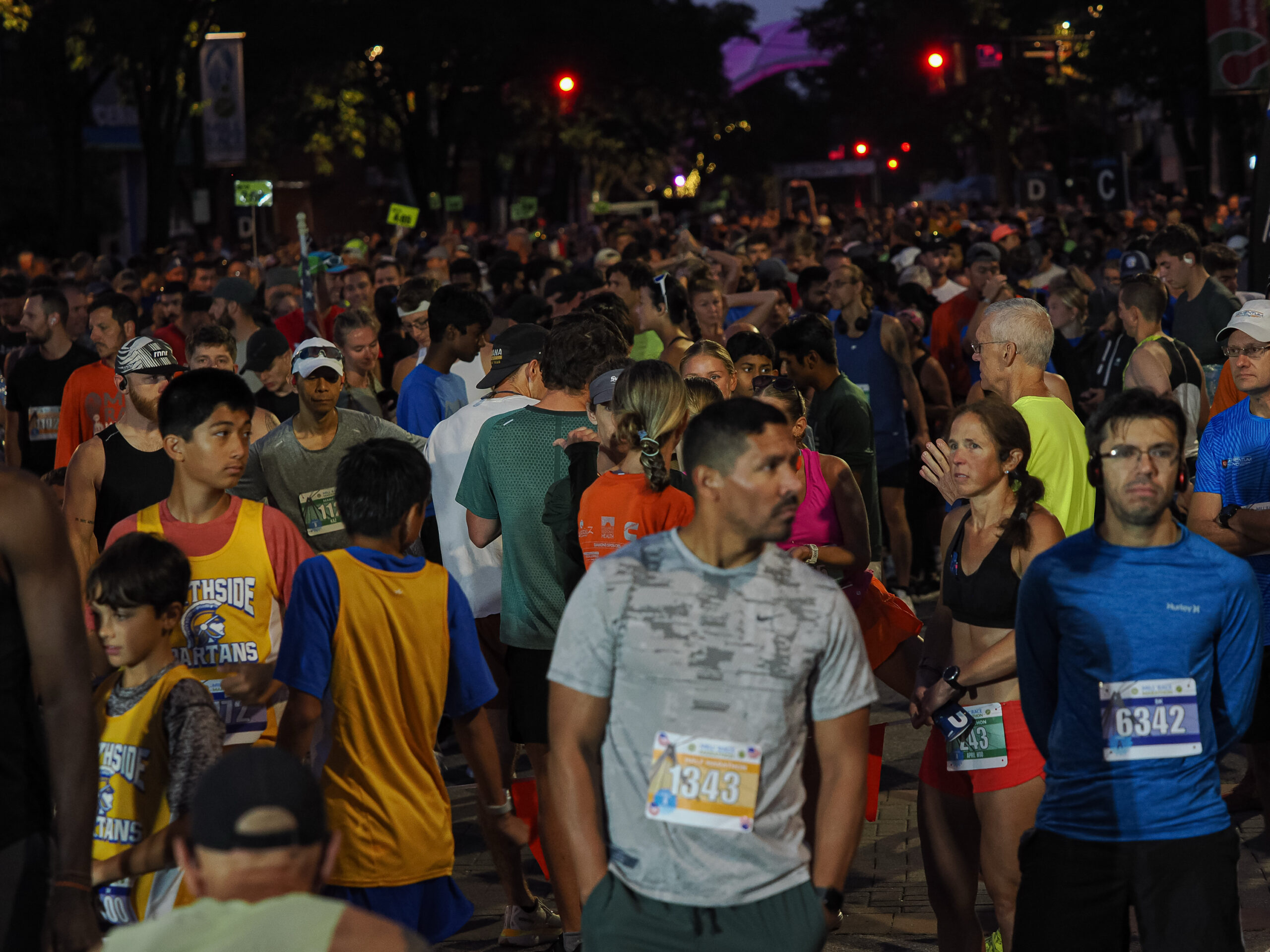 People gather on Washington Street for the start of the Mill Race Marathon in downtown Columbus, Ind., Sept. 27, 2025.
