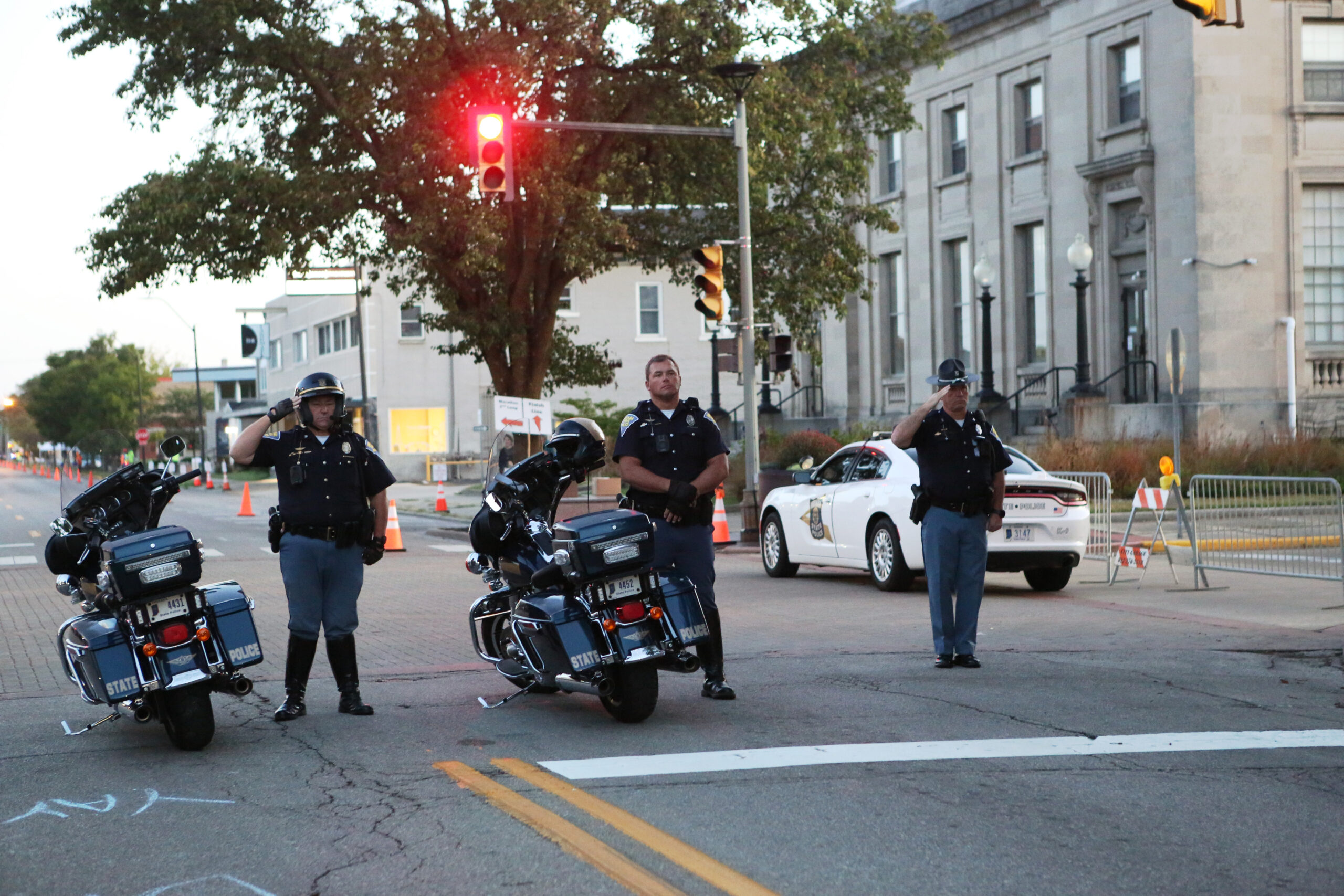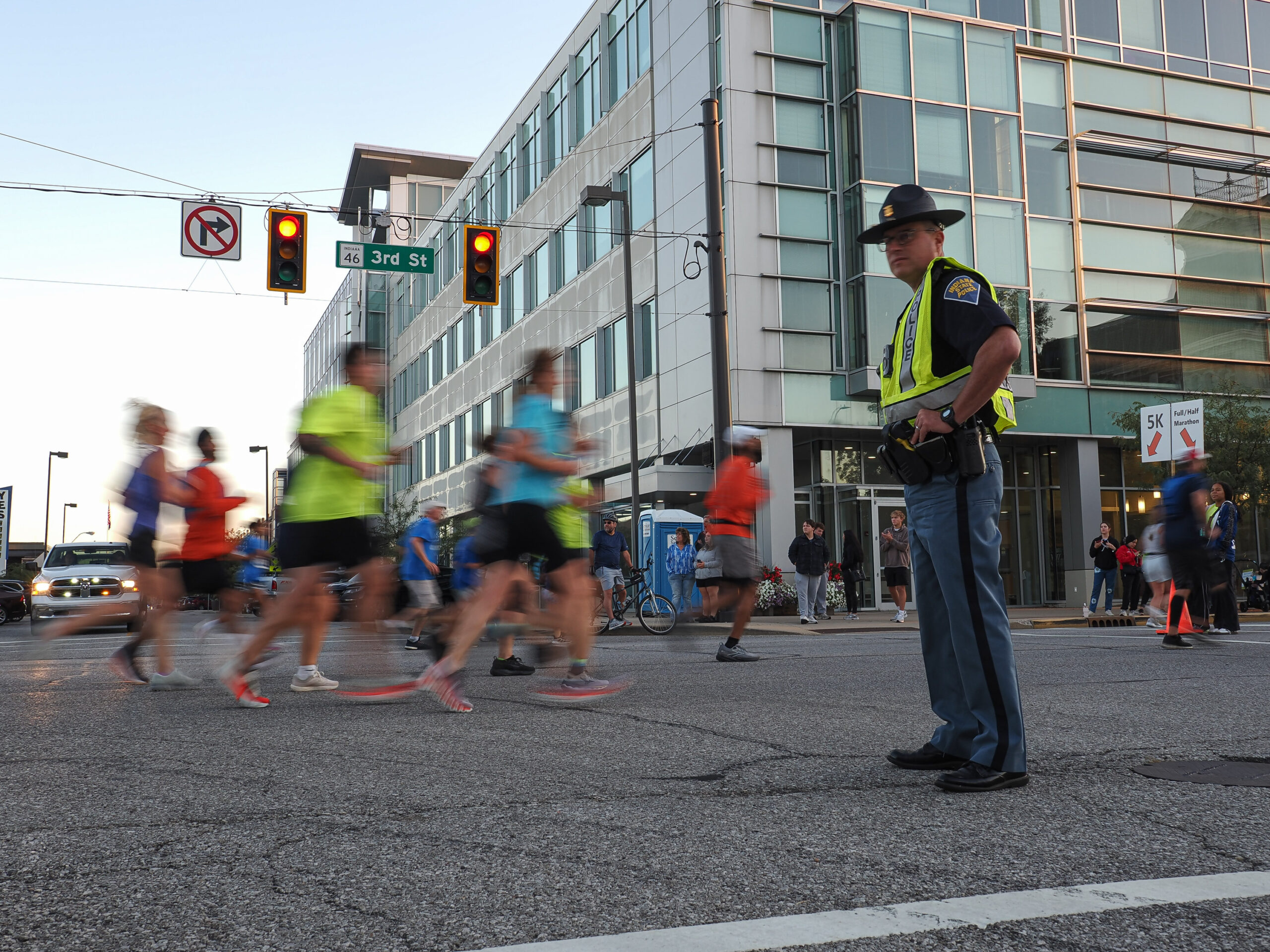Uniformed officers stand at attention for the National Anthem during the Mill Race Marathon, Columbus, Ind., Saturday, September 27, 2025