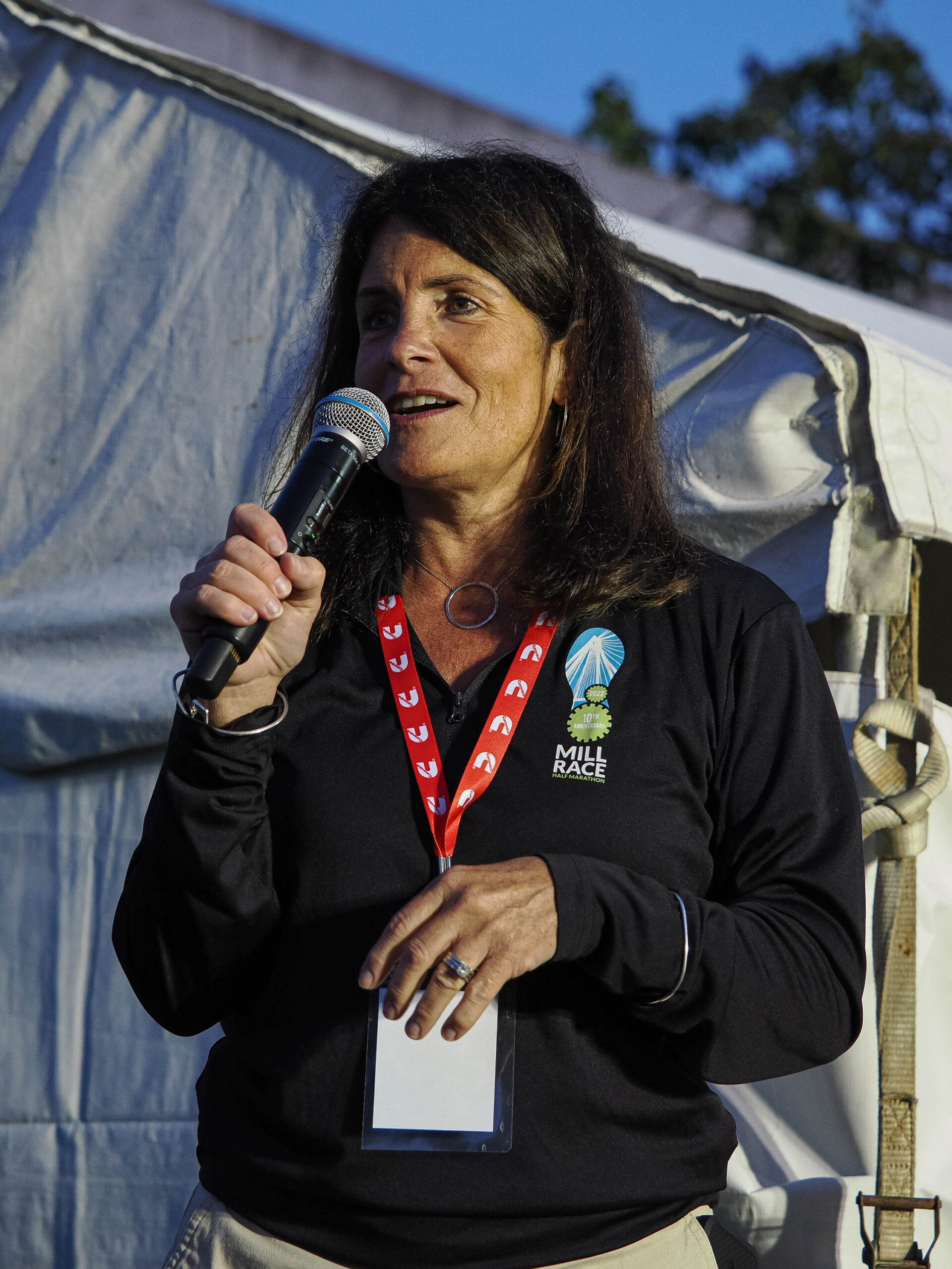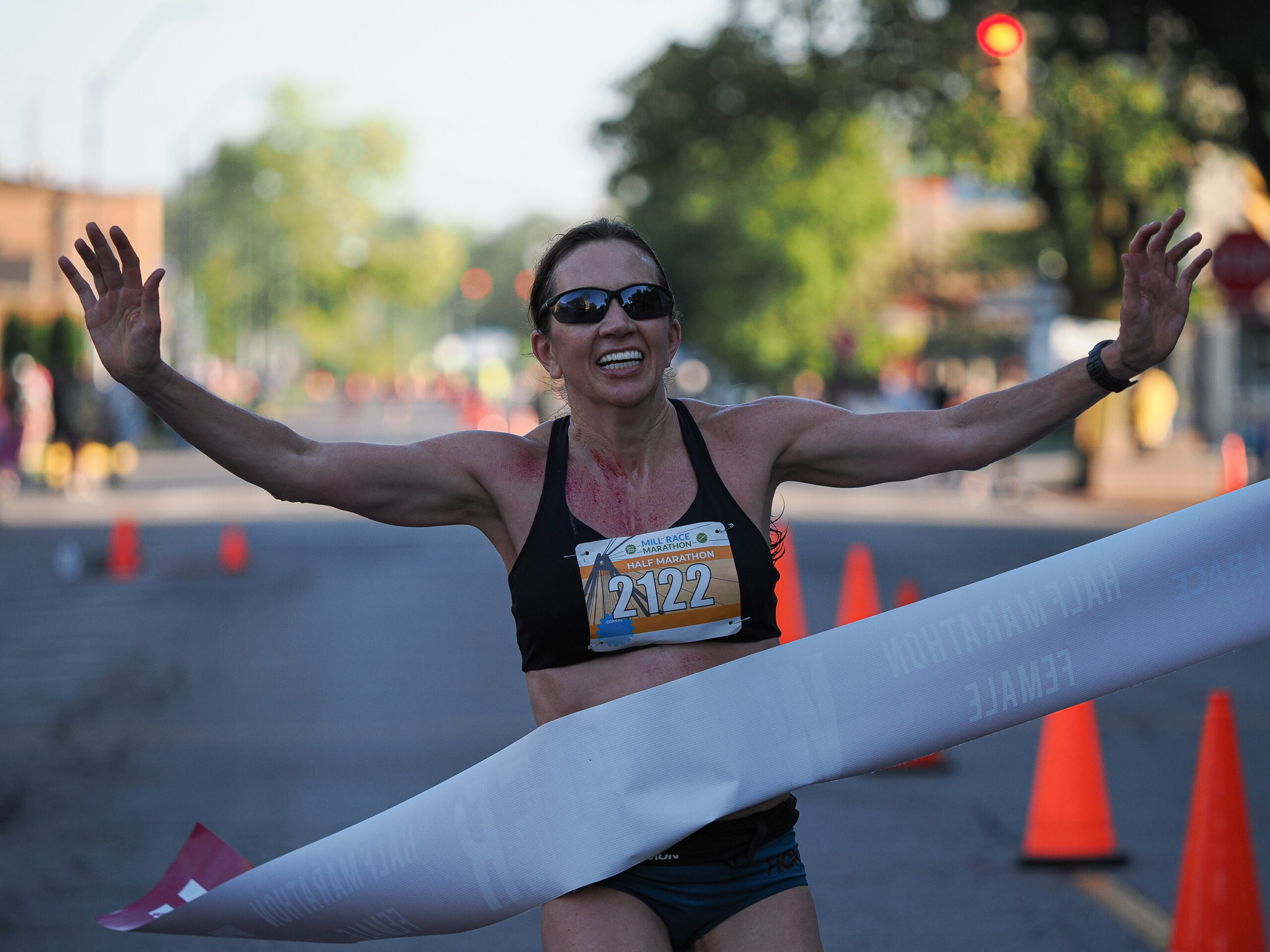 2025 Mill Race Marathon, Half Marathon Women’s winner, Tera Moody crosses the start/finish line.