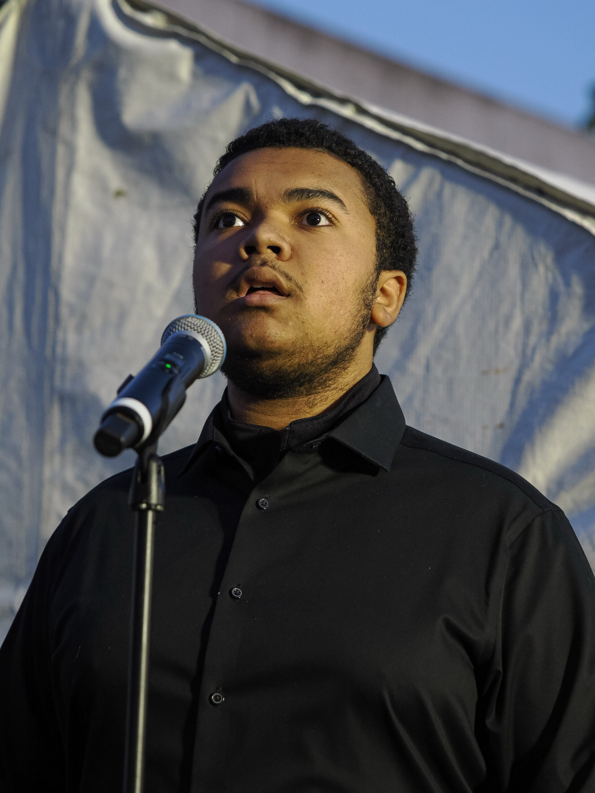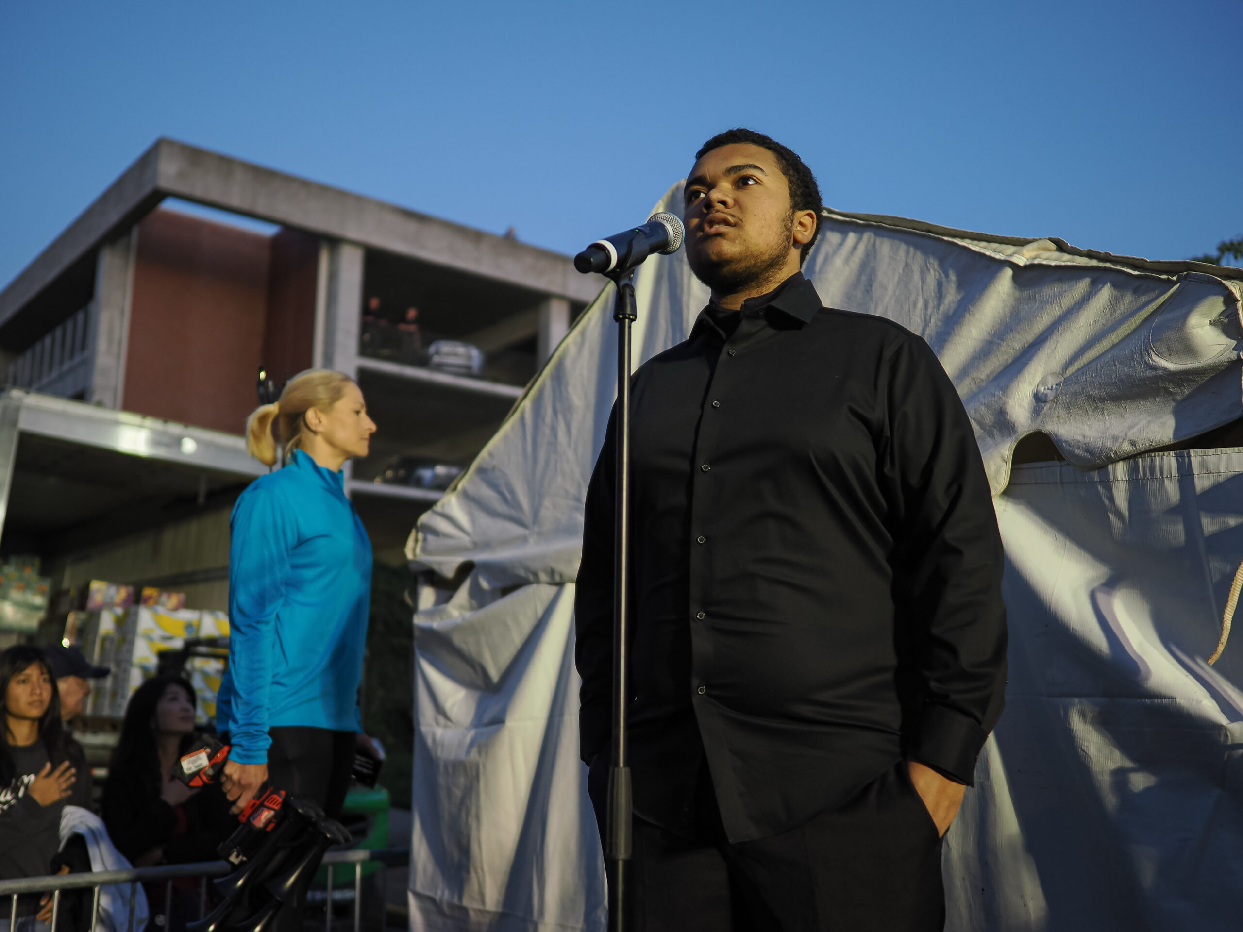 CSA New Tech sophomore Alaijah Hill sings the national anthem at the start of the Mill Race Marathon in Columbus, Ind., Saturday, Sept. 27, 2025.