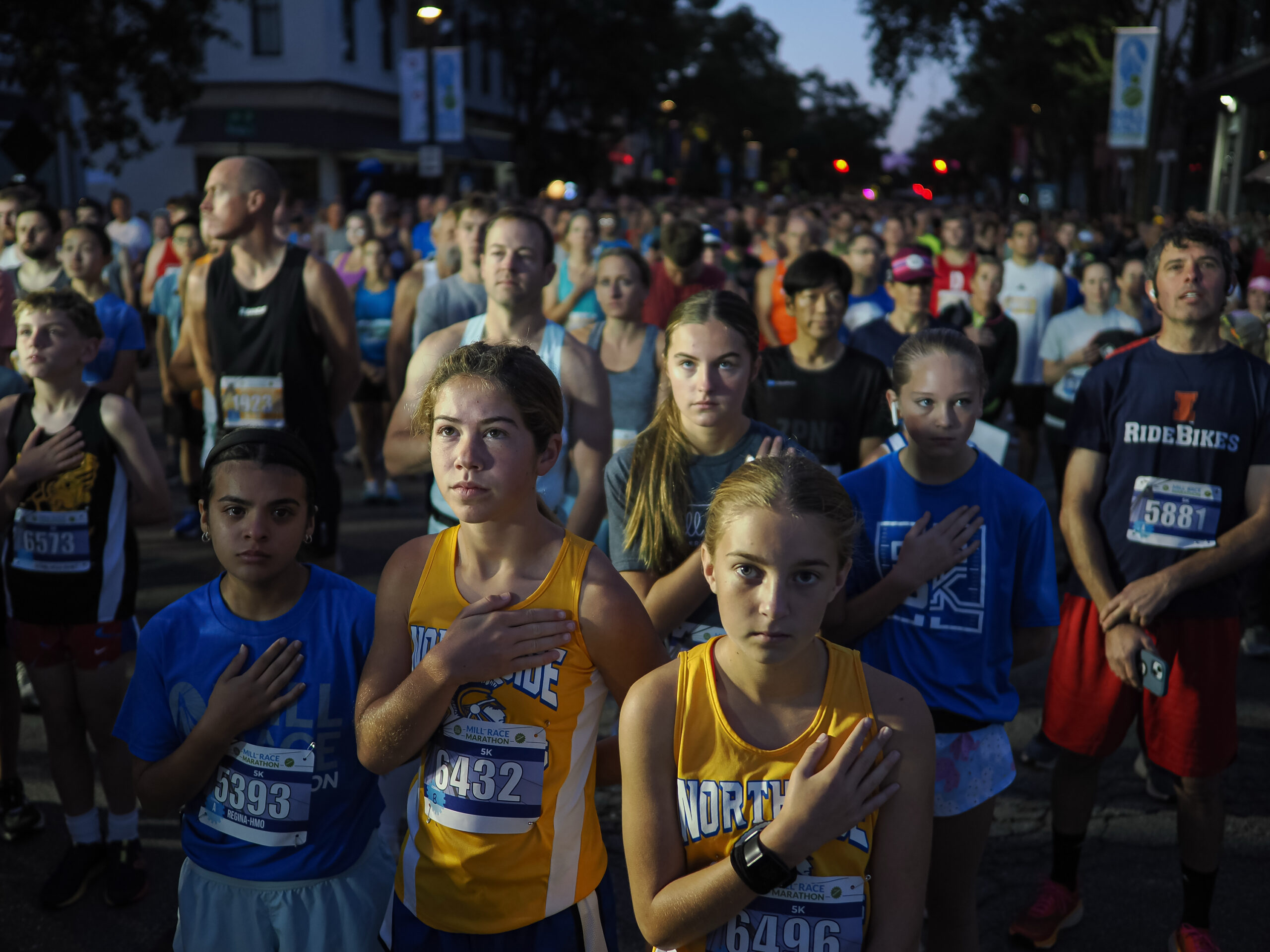 Competitiors put their hands over their hearts during the singing of the national anthem at the start of the Mill Race Marathon in Columbus, Ind., Saturday, Sept. 27, 2025.