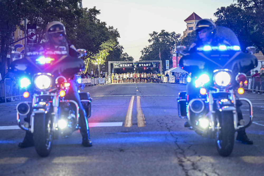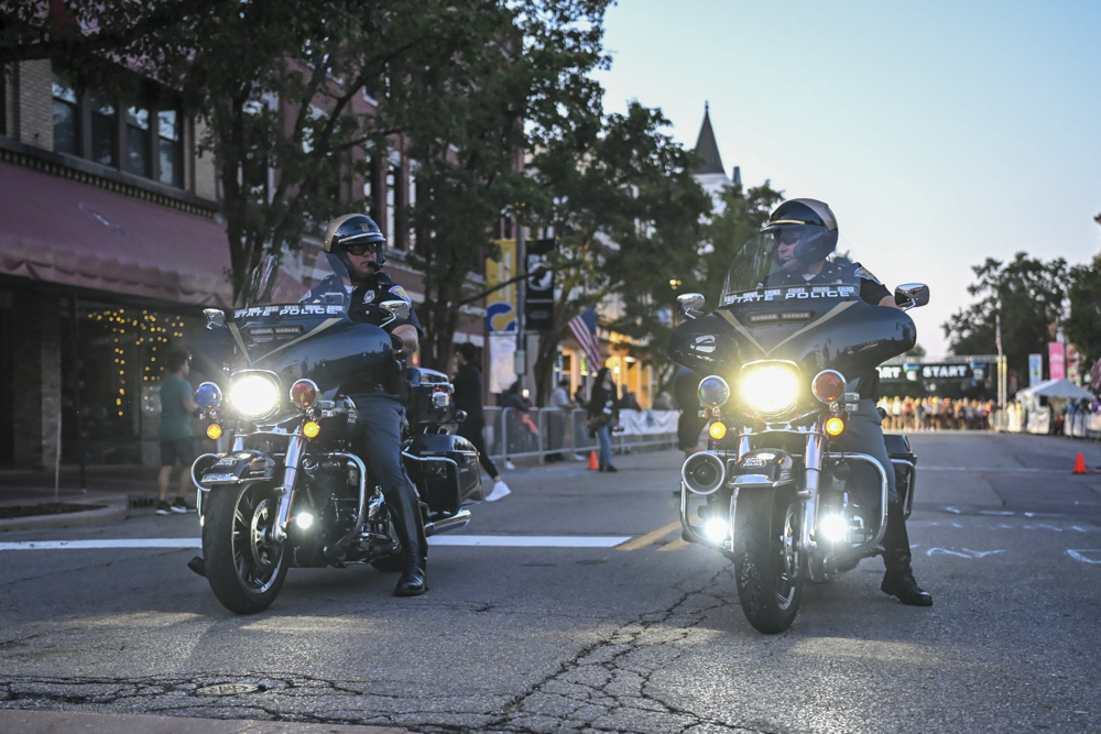 Indiana State Police motorcycle division gets ready to escort the Mill Race Marathon runners on Saturday morning.