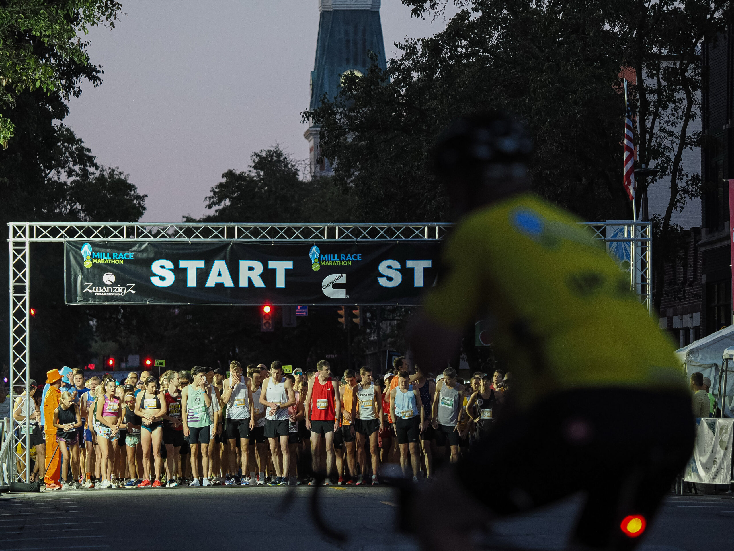 Runners gather at the start line for the Mill Race Marathon in downtown Columbus, Ind., Saturday, Sept. 27, 2025.