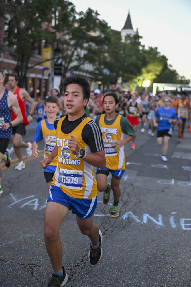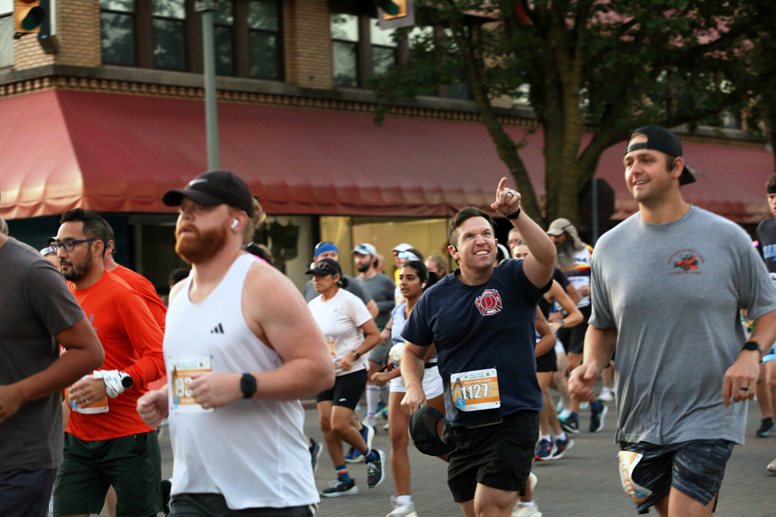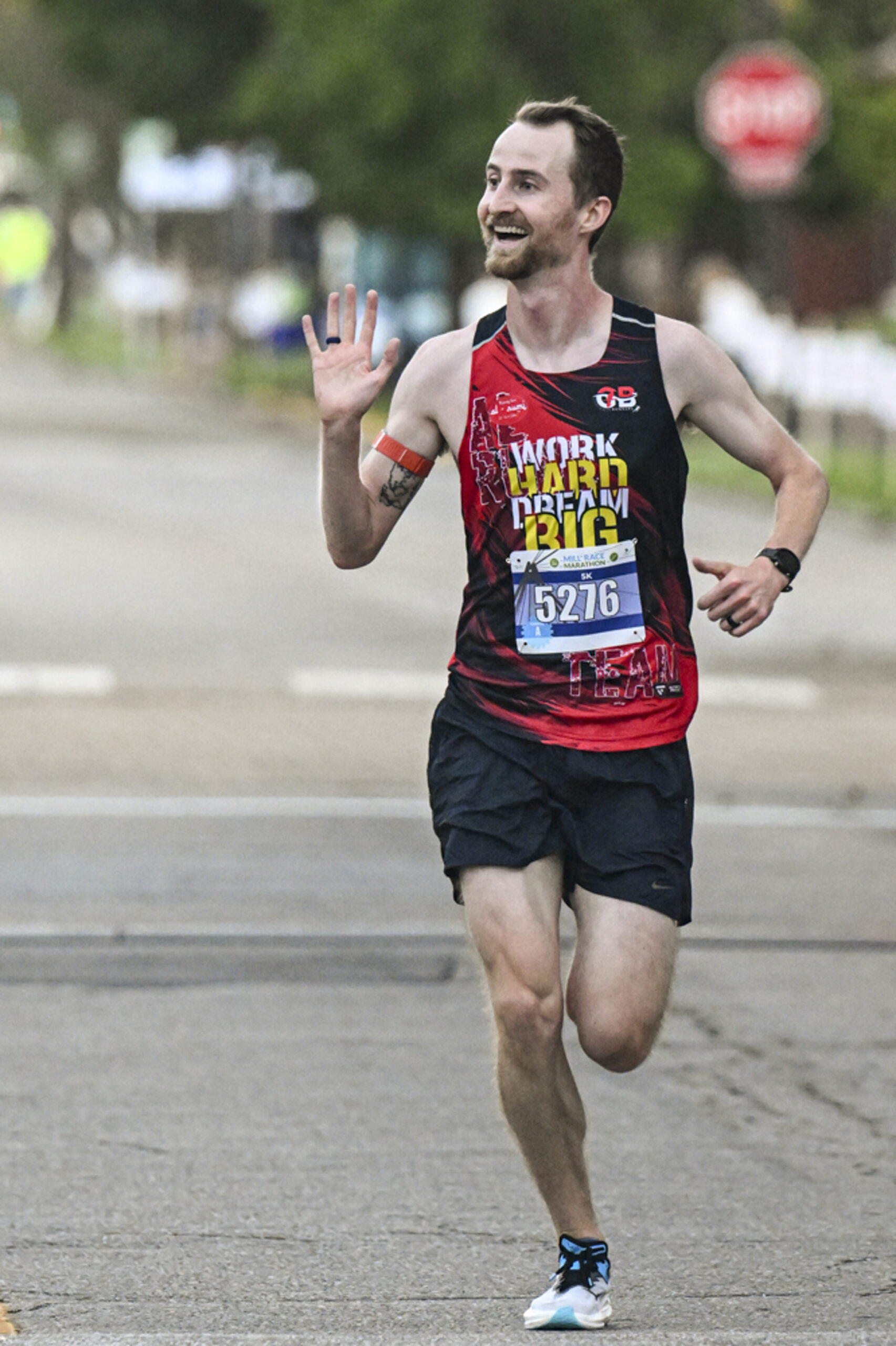 2025 Mill Race Marathon 5k Men’s winner, Ryan Frazier waves to the crowd as he crosses the start/finish line.