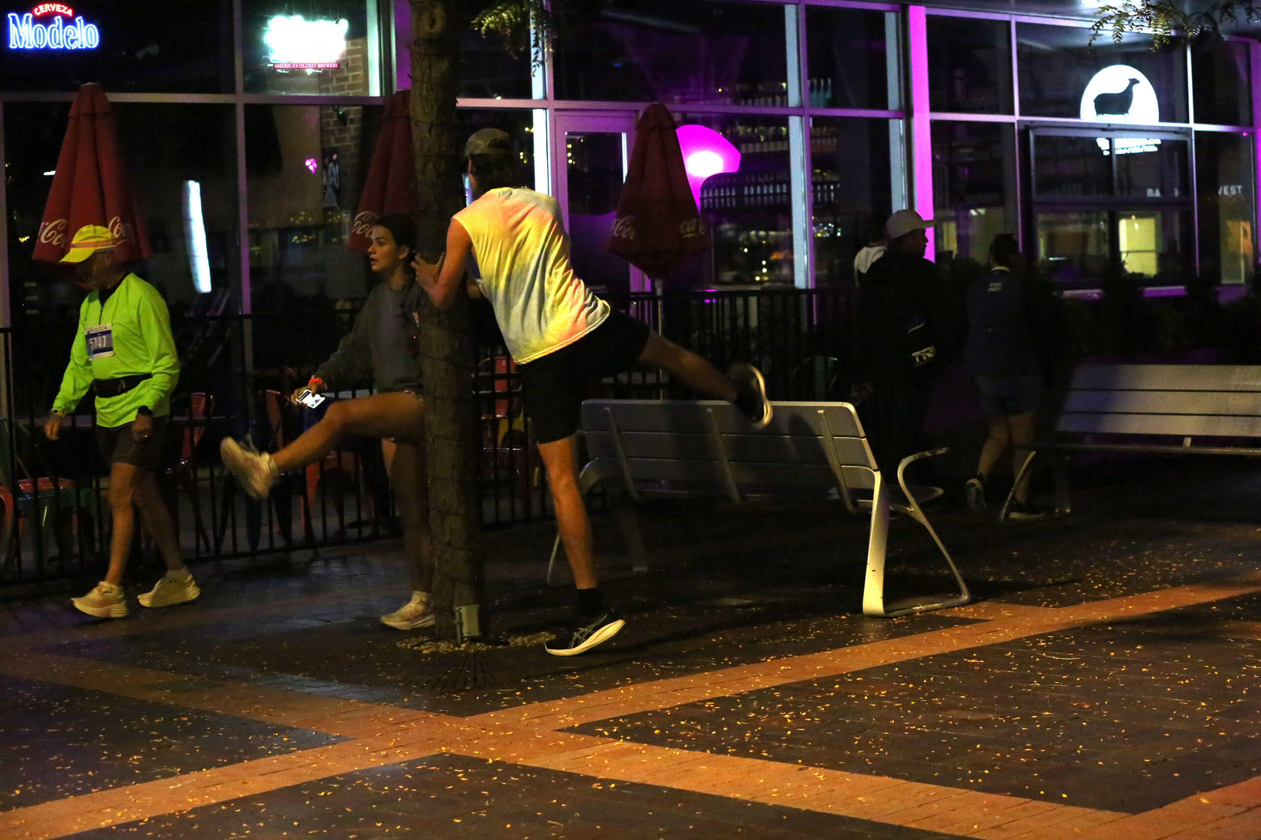 Mill Race Marathon participants stretch and keep warm before the start of the marathon in downtown Columbus, Ind., Saturday, Sept. 27, 2025.