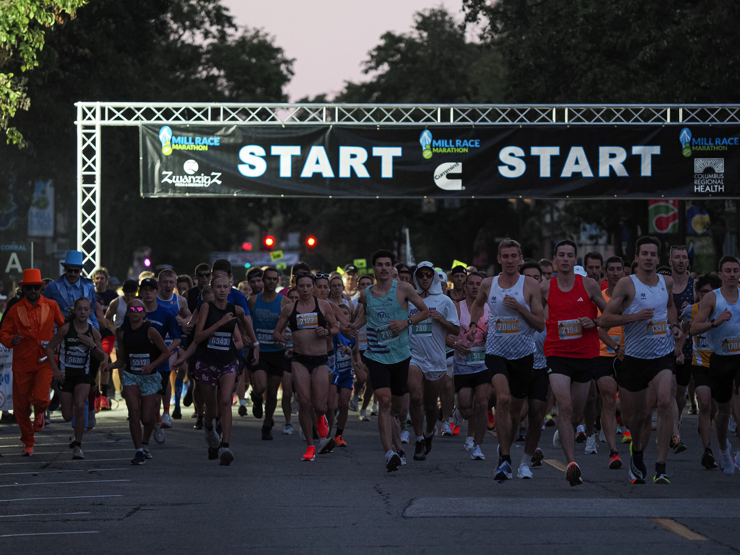 Runners takeoff down Washington Street at the start of the Mill Race Marathon in downtown Columbus, Ind., Saturday, Sept. 27, 2025.