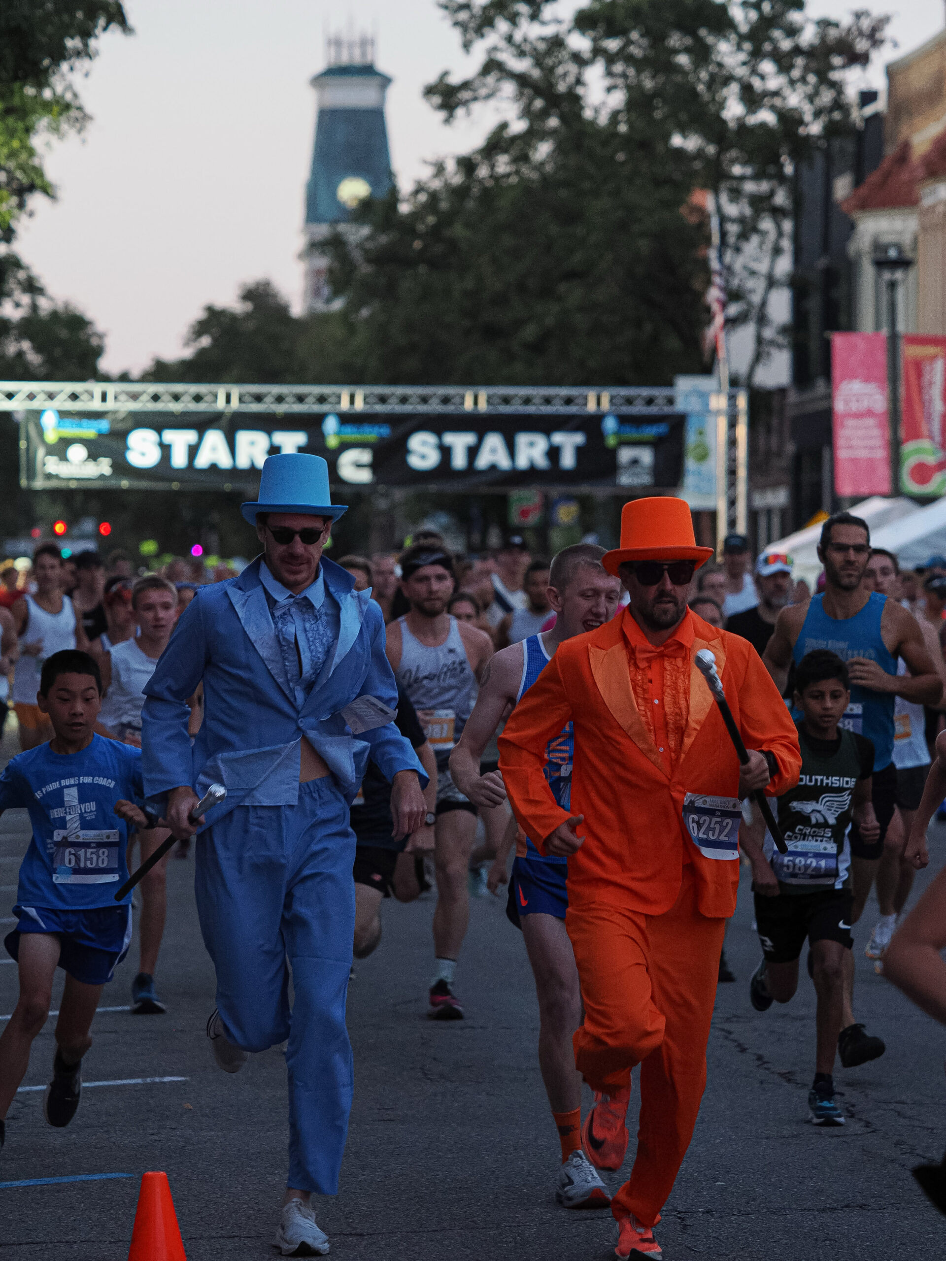 Dalton Lancaster, left, and Malachi Henry are dressed like Harry and Lloyd from the movie Dumb and Dumber to compete in the 5K portion of the Mill Race Marathon in downtown Columbus, Ind., Sept. 27, 2025.