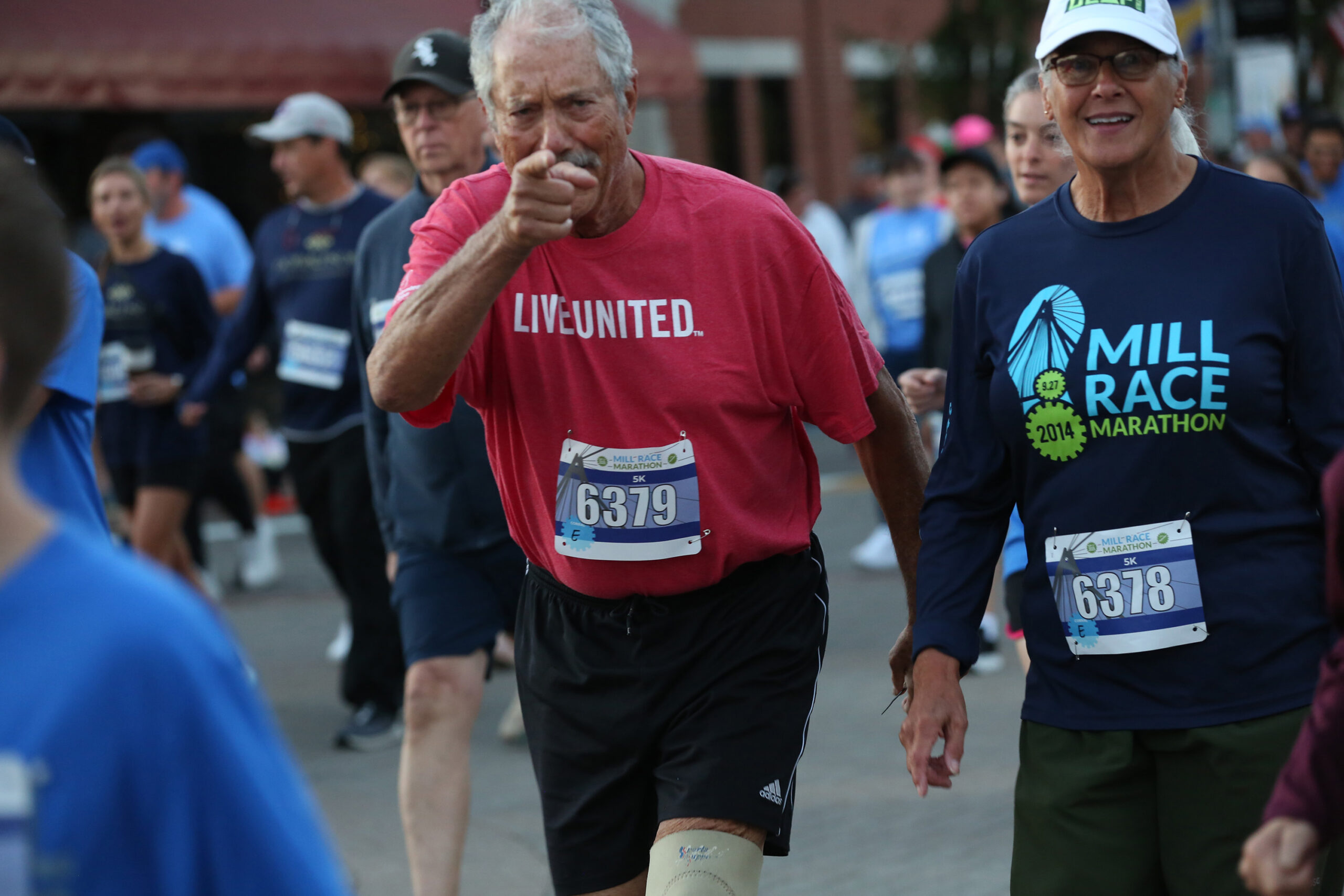 Rich Gold points as he participates with his wife Alice Gold in the 5k during the Mill Race Marathon, Columbus, Ind., Saturday, September 27, 2025
