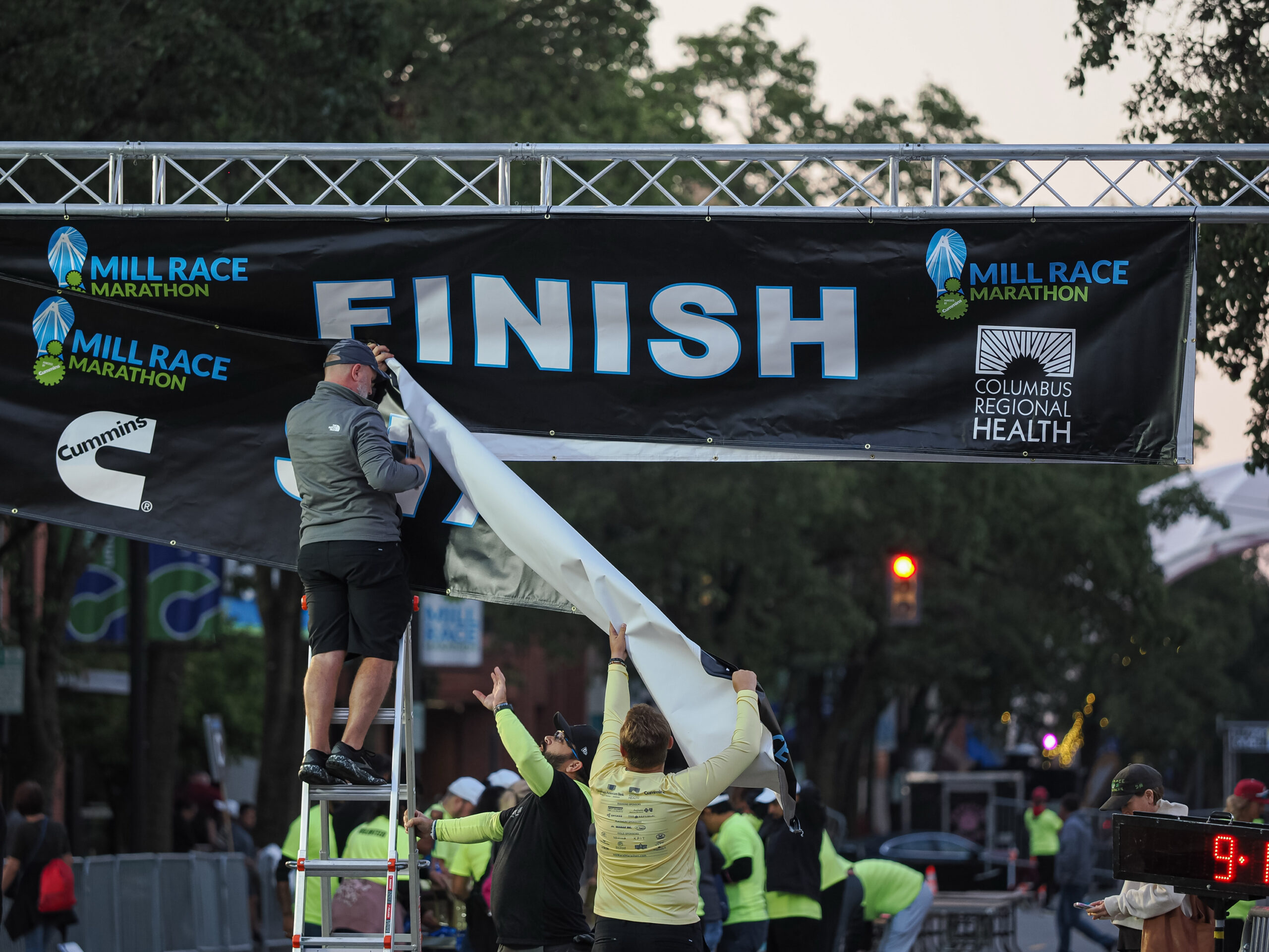 Volunteers convert the start line to the finish line during the Mill Race Marathon in downtown Columbus, Ind., Sept. 27, 2025.
