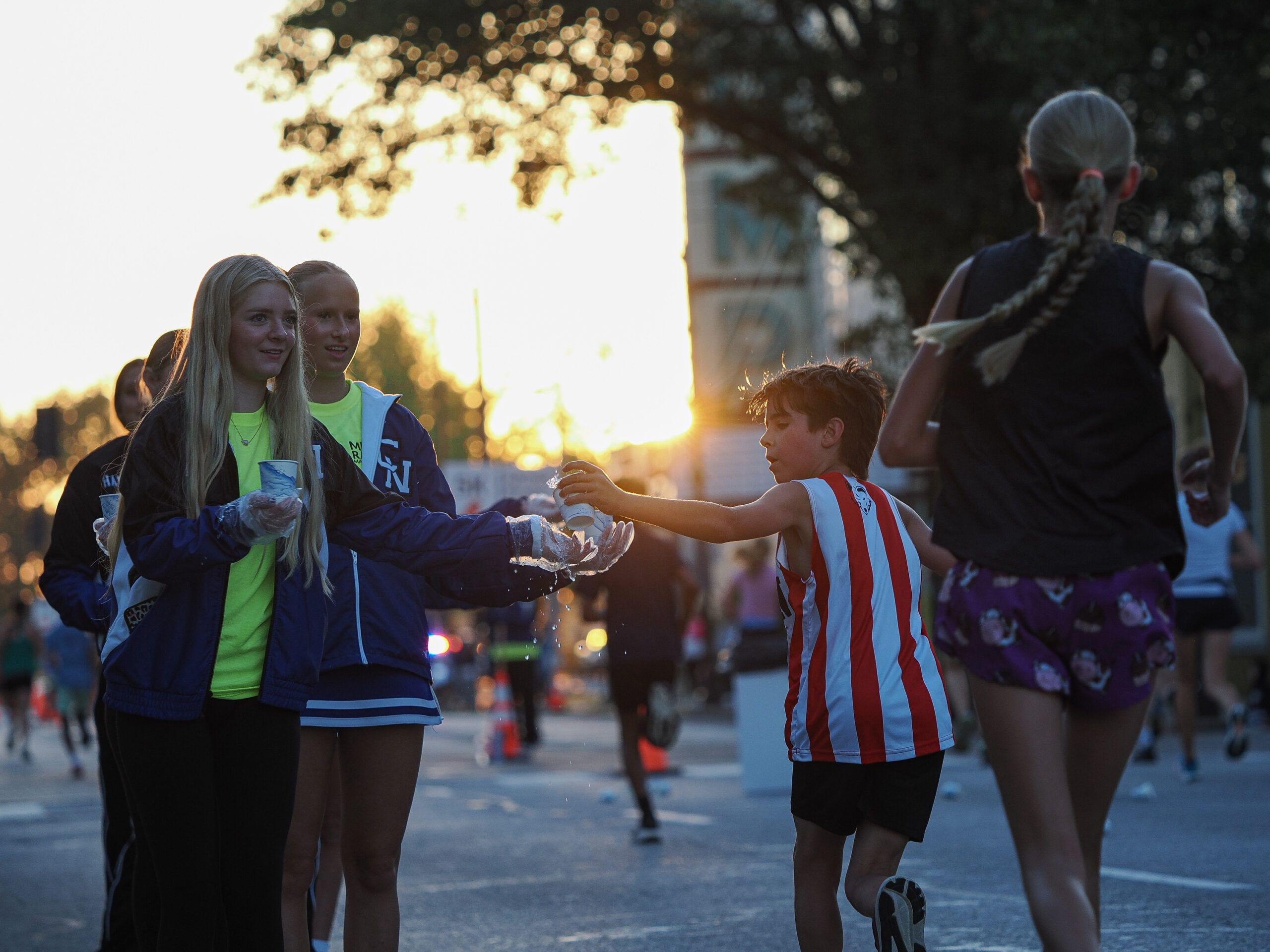 Runners grab water from a hydration station on Third Street during the Mill Race Marathon in downtown Columbus, Ind., Sept. 27, 2025.
