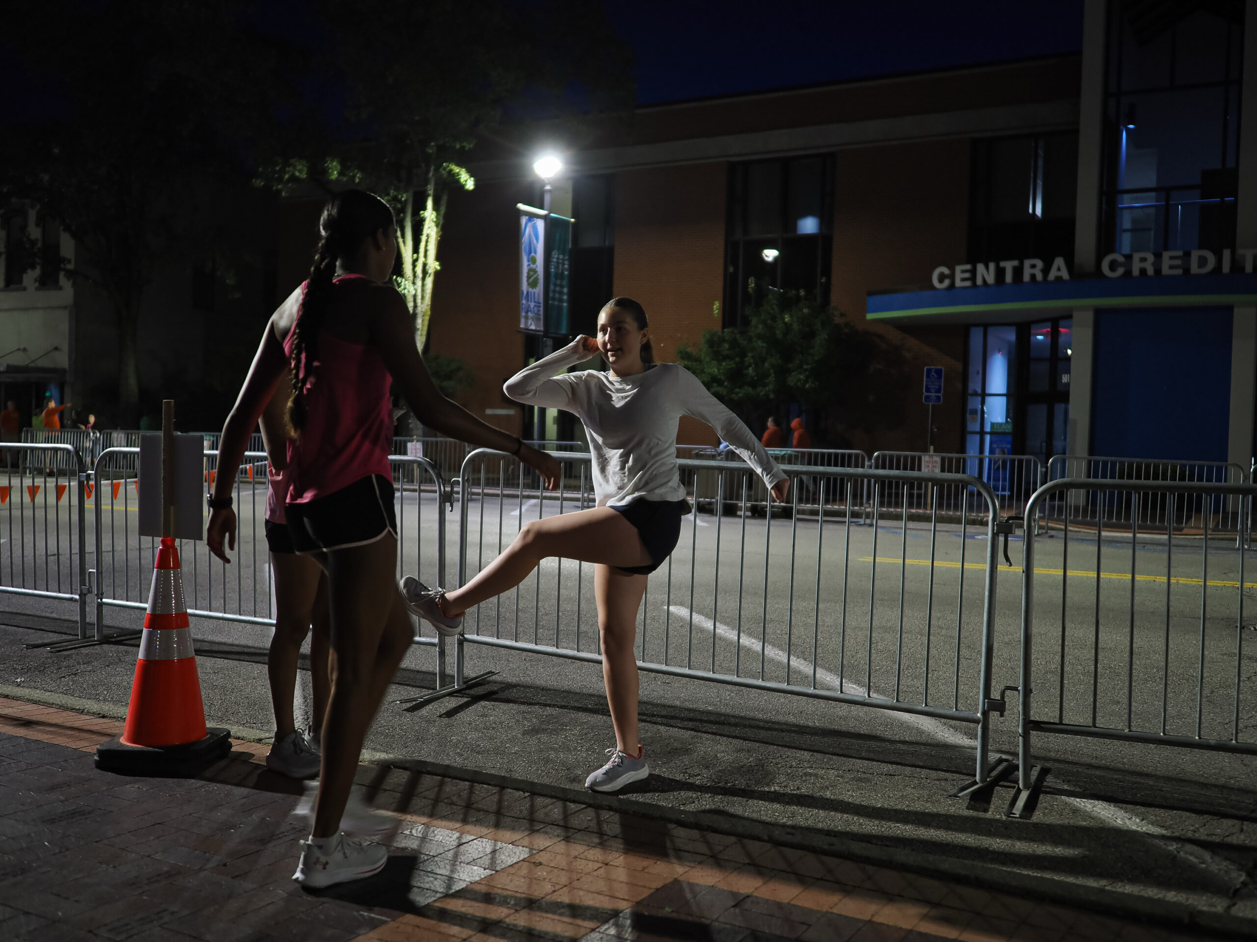 Columbus North students Vivian Munger, from right, Mridula Muthukumaran and Nandini Kondhare stretch before competing in the Mill Race Marathon in downtown Columbus, Ind., Sept. 27, 2025.