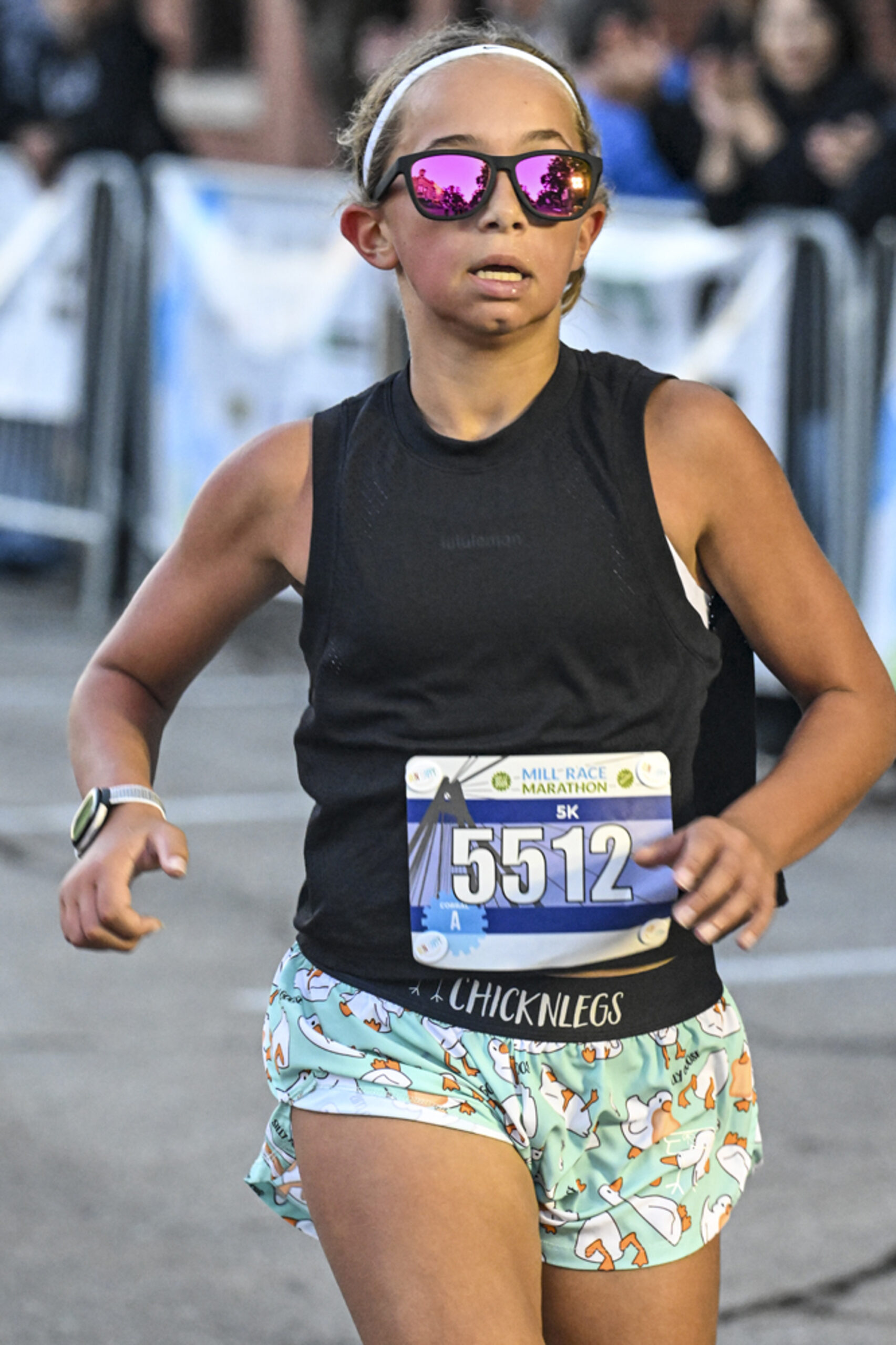2025 Mill Race Marathon 5k Women’s 2nd place finisher, Giuliana MacKos crosses the start/finish line.