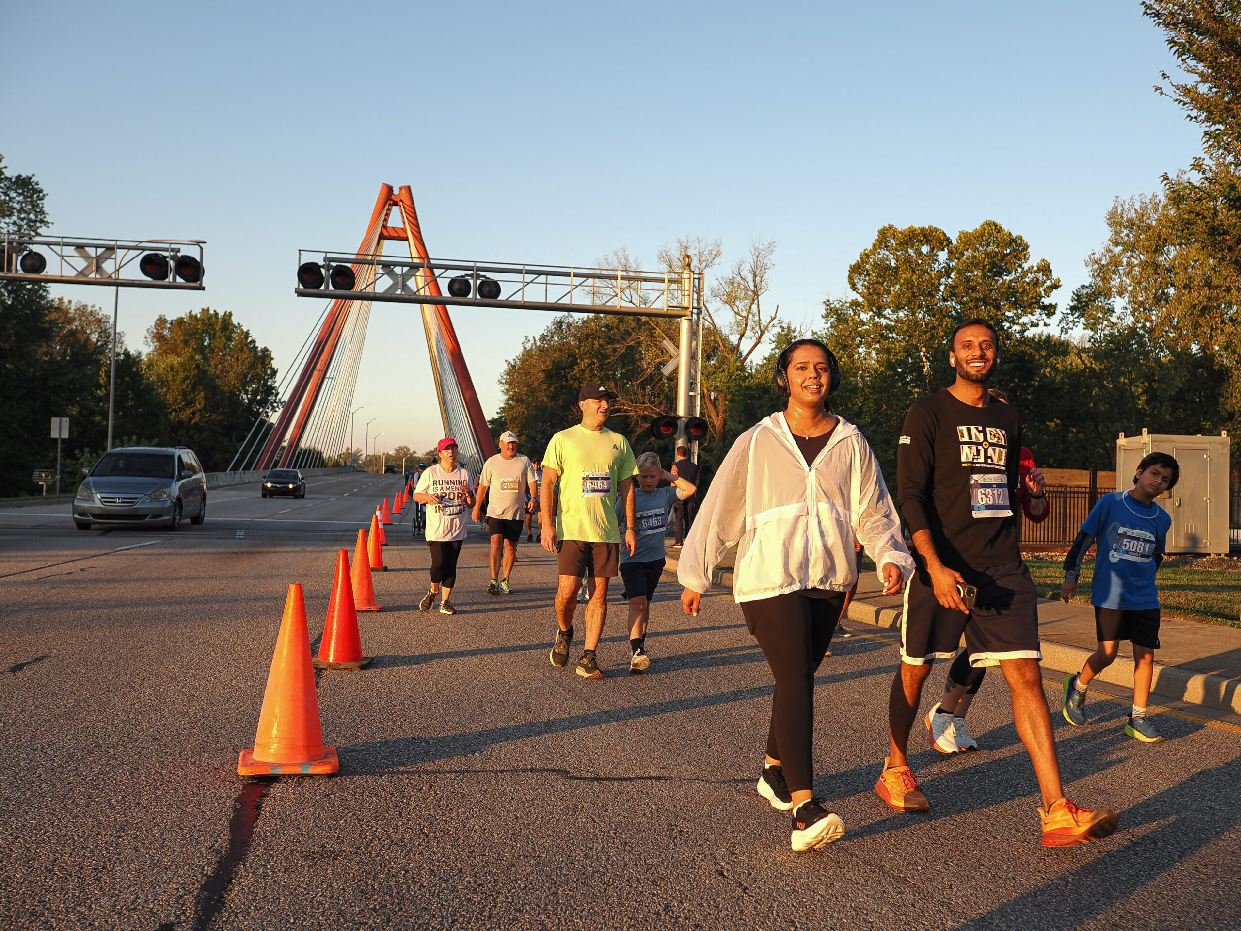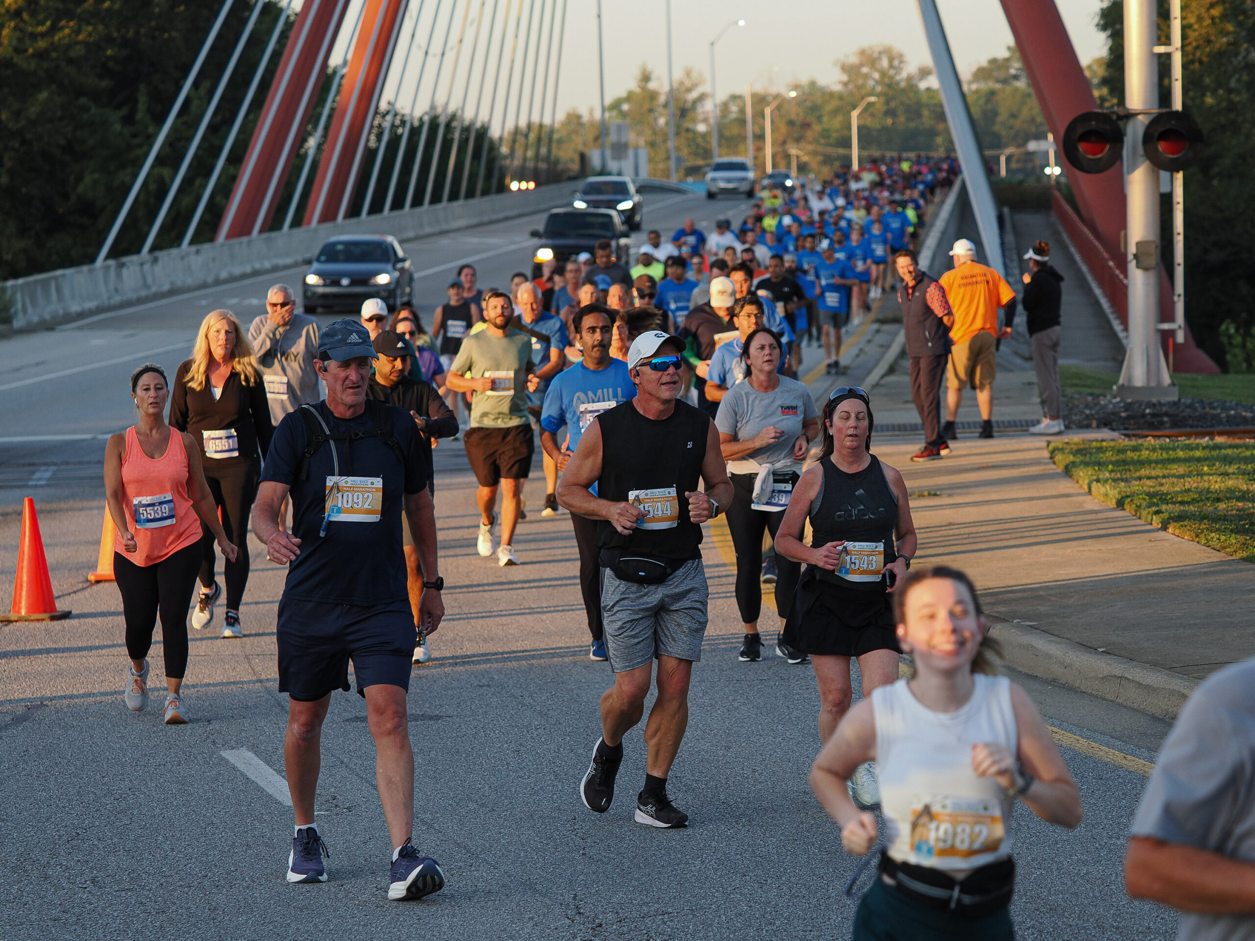 Runners cross the Robert N. Stewart Bridge during the Mill Race Marathon in downtown Columbus, Ind., Sept. 27, 2025.
