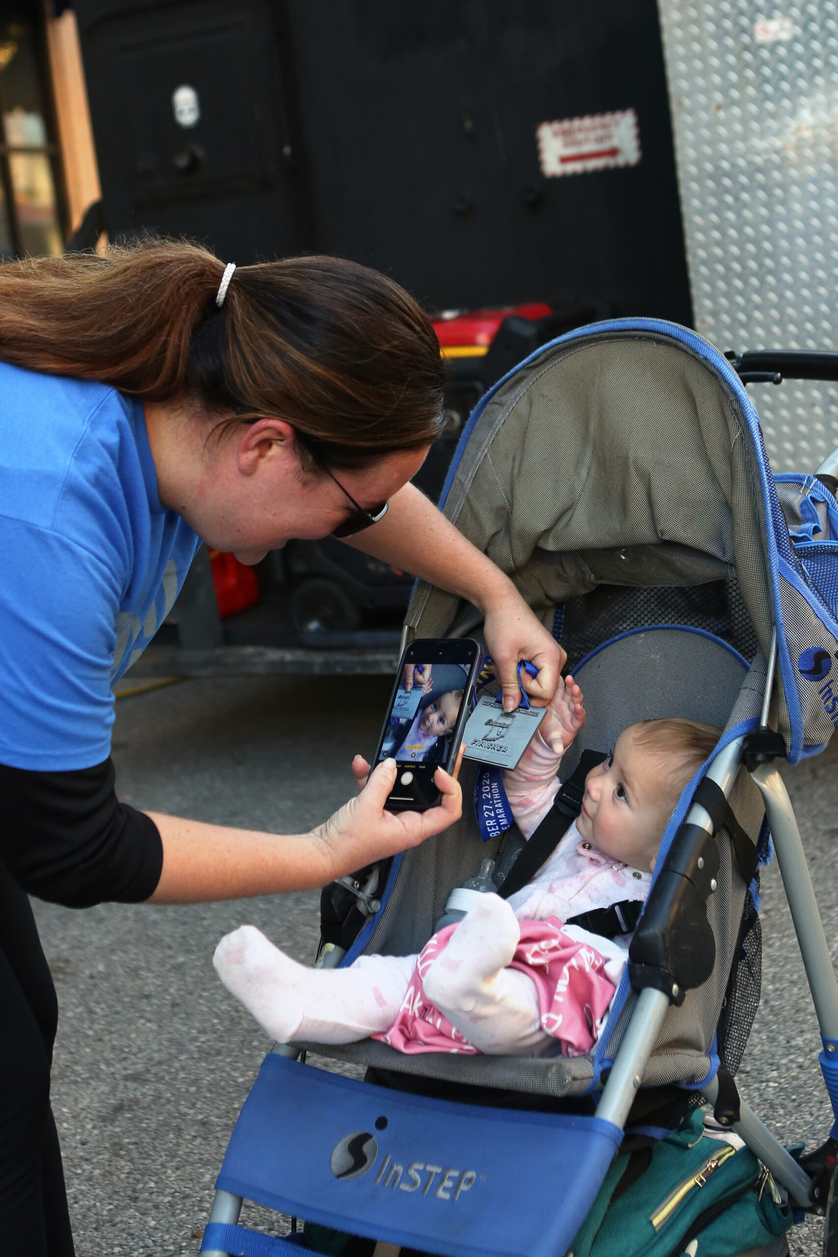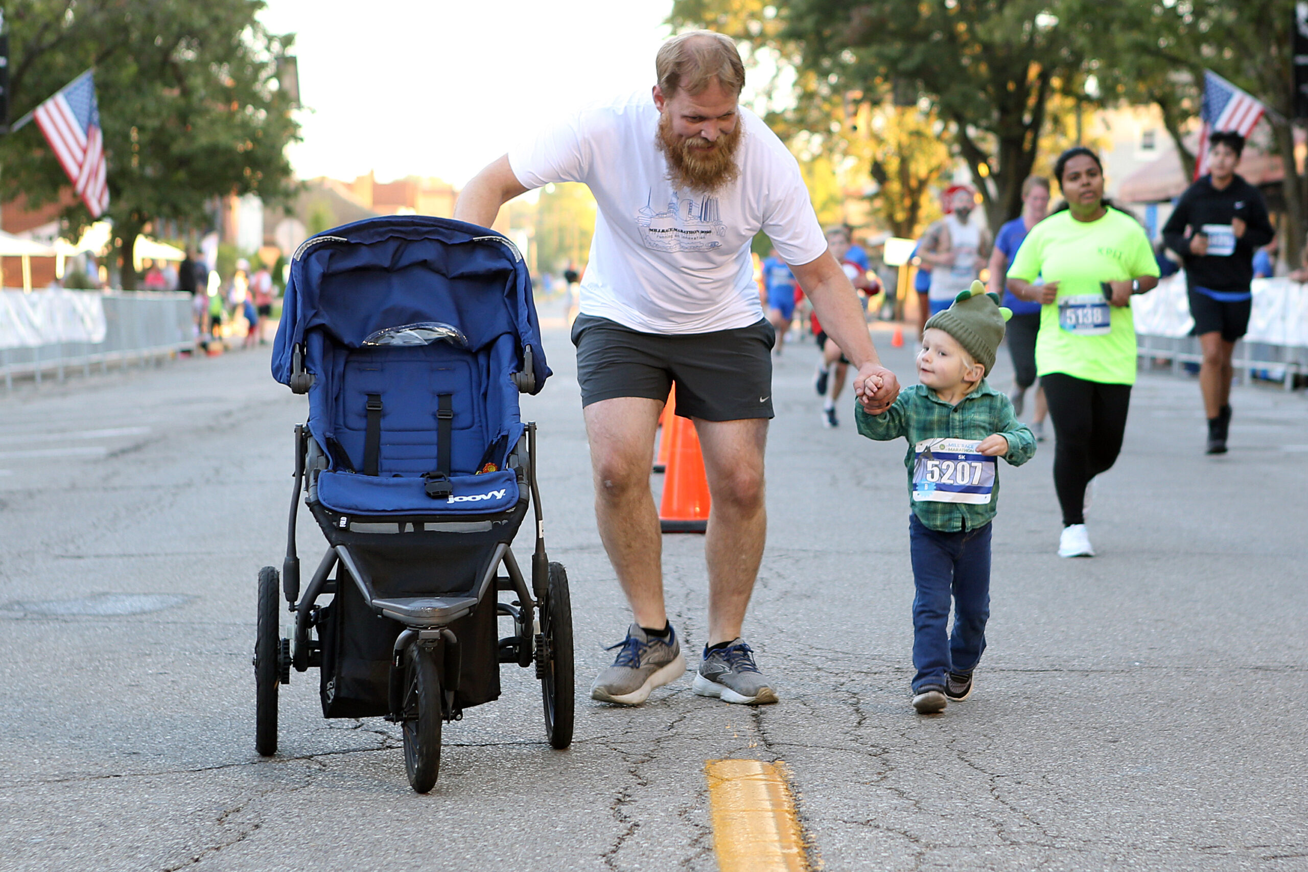 Dylan Brock, holding Adri, heads to the stage to claim the gas grill he won in the drawing at Finish on 4th during the Mill Race Marathon, Columbus, Ind., Saturday, September 27, 2025.