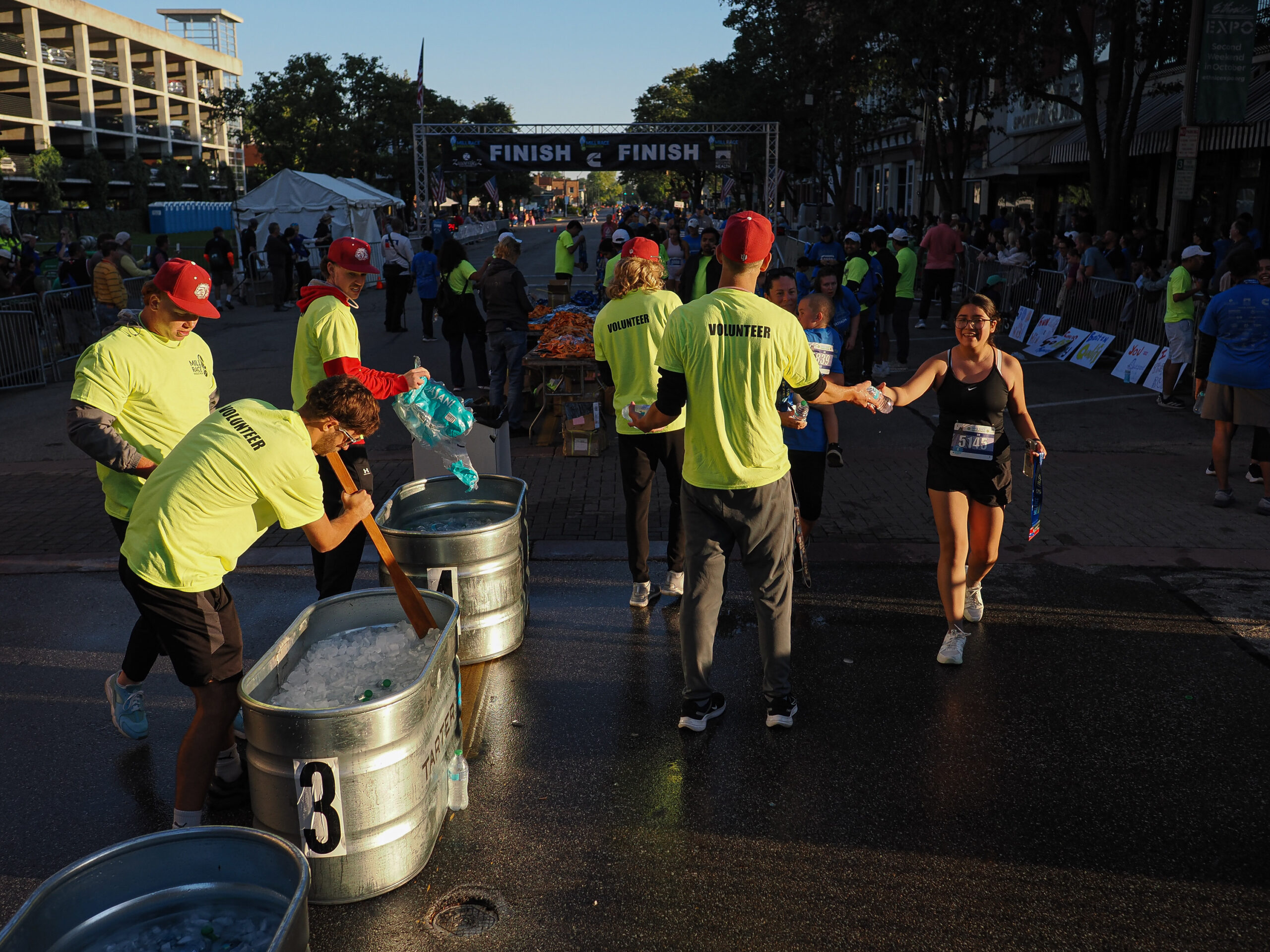 Volunteers hand out water near the finish line during the Mill Race Marathon in downtown Columbus, Ind., Sept. 27, 2025.