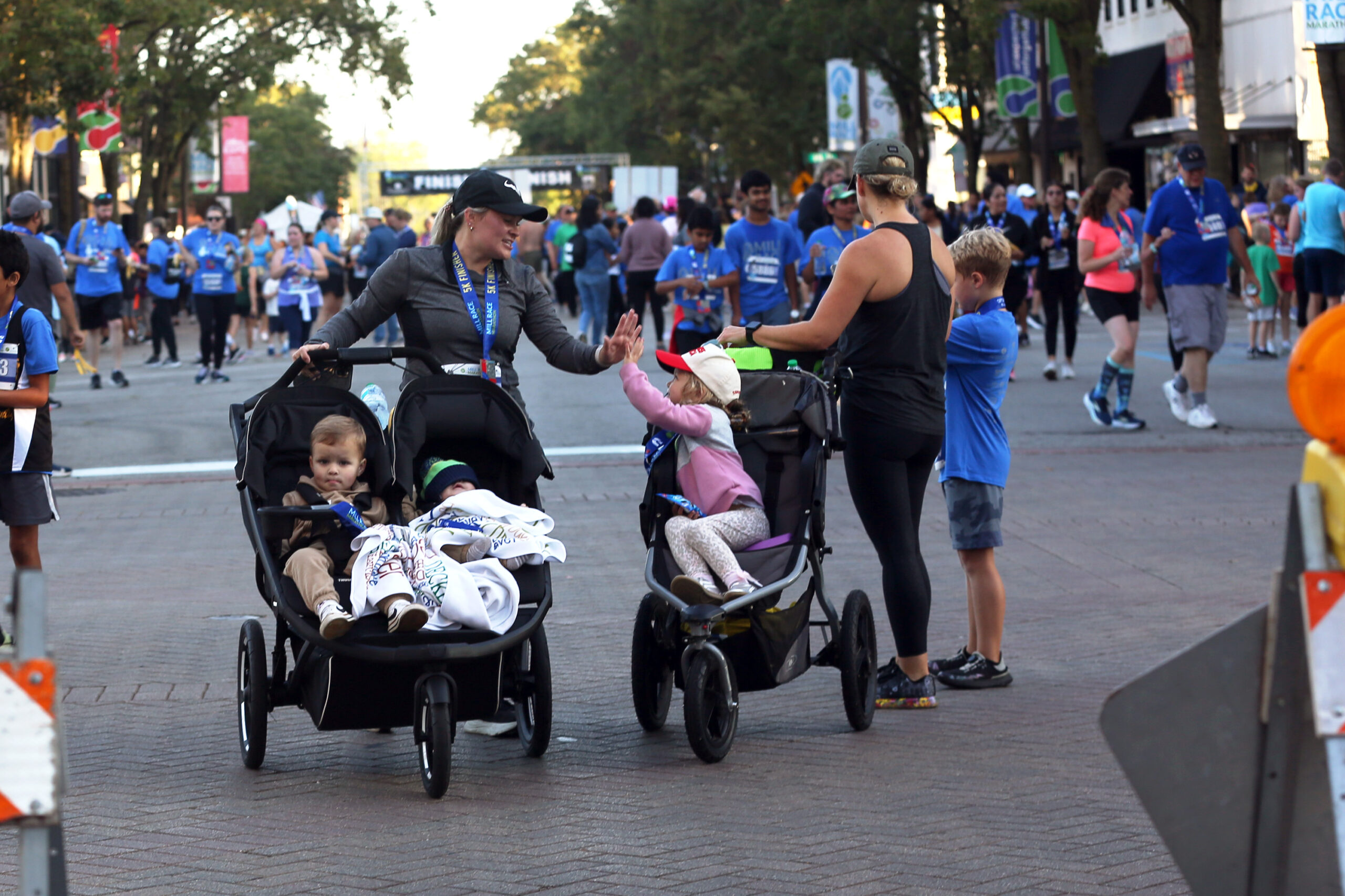 Caitlyn Duke high fives with Brexley Nolting during the Mill Race Marathon, Columbus, Ind., Saturday, September 27, 2025