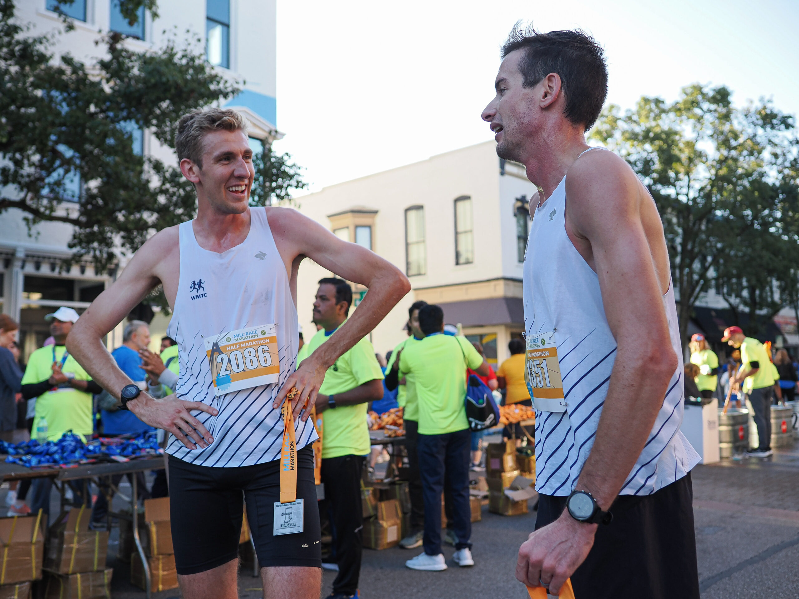 2025 Mill Race Marathon, Half Marathon Men’s 2nd place finisher, Curtis Eckstein jokes with the winner after they cross the finish line.