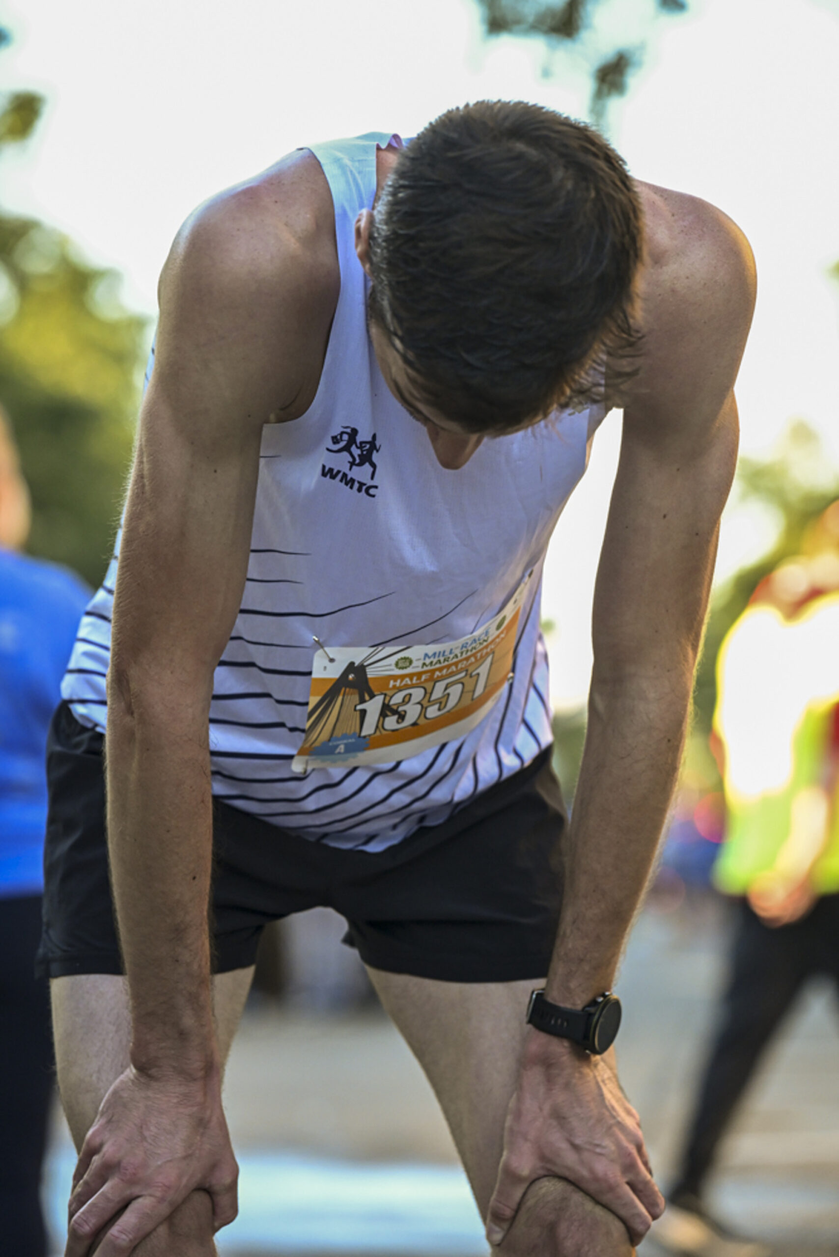 2025 Mill Race Marathon, Half Marathon Men’s winner, Johnnie Guy catches his breathe after running.