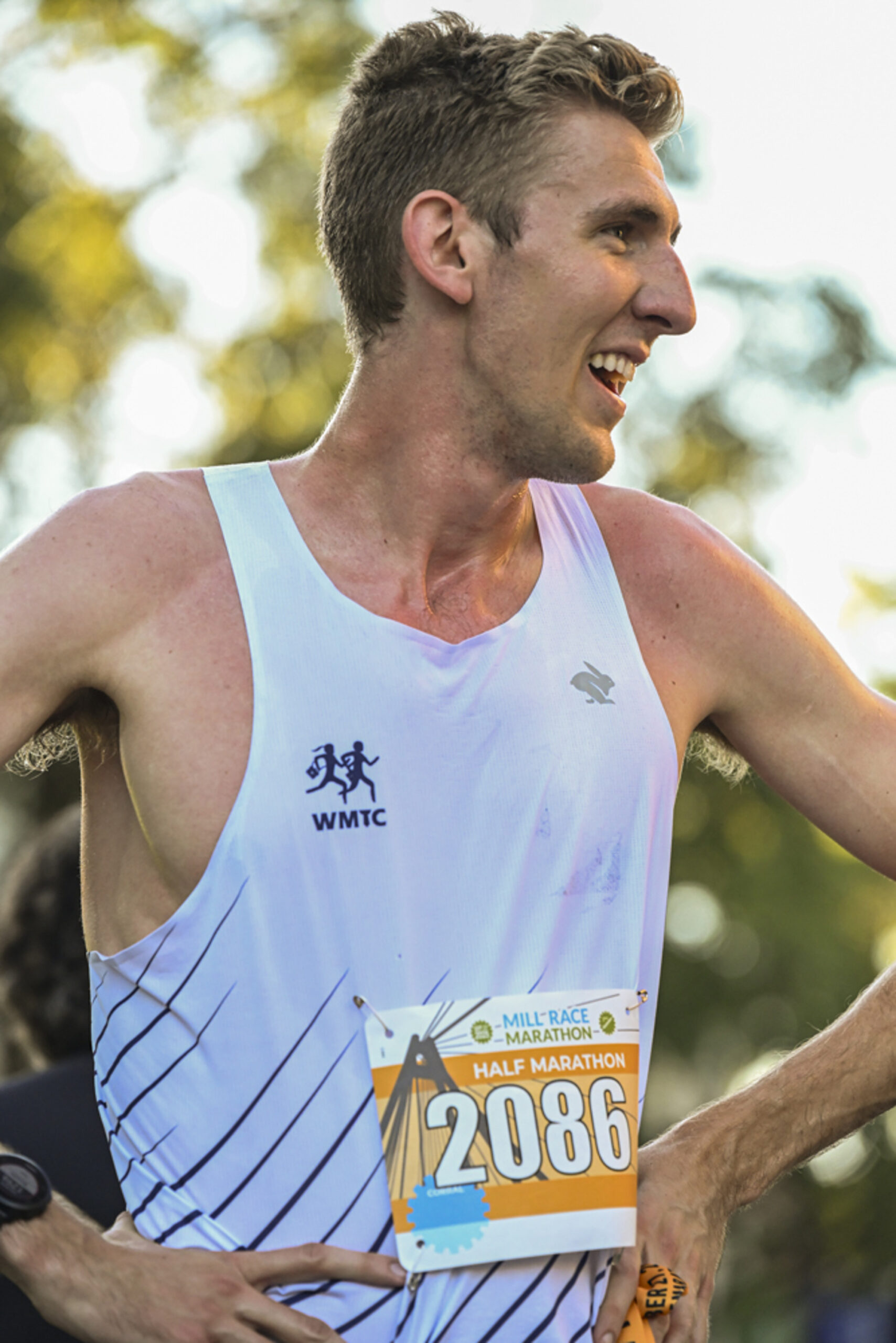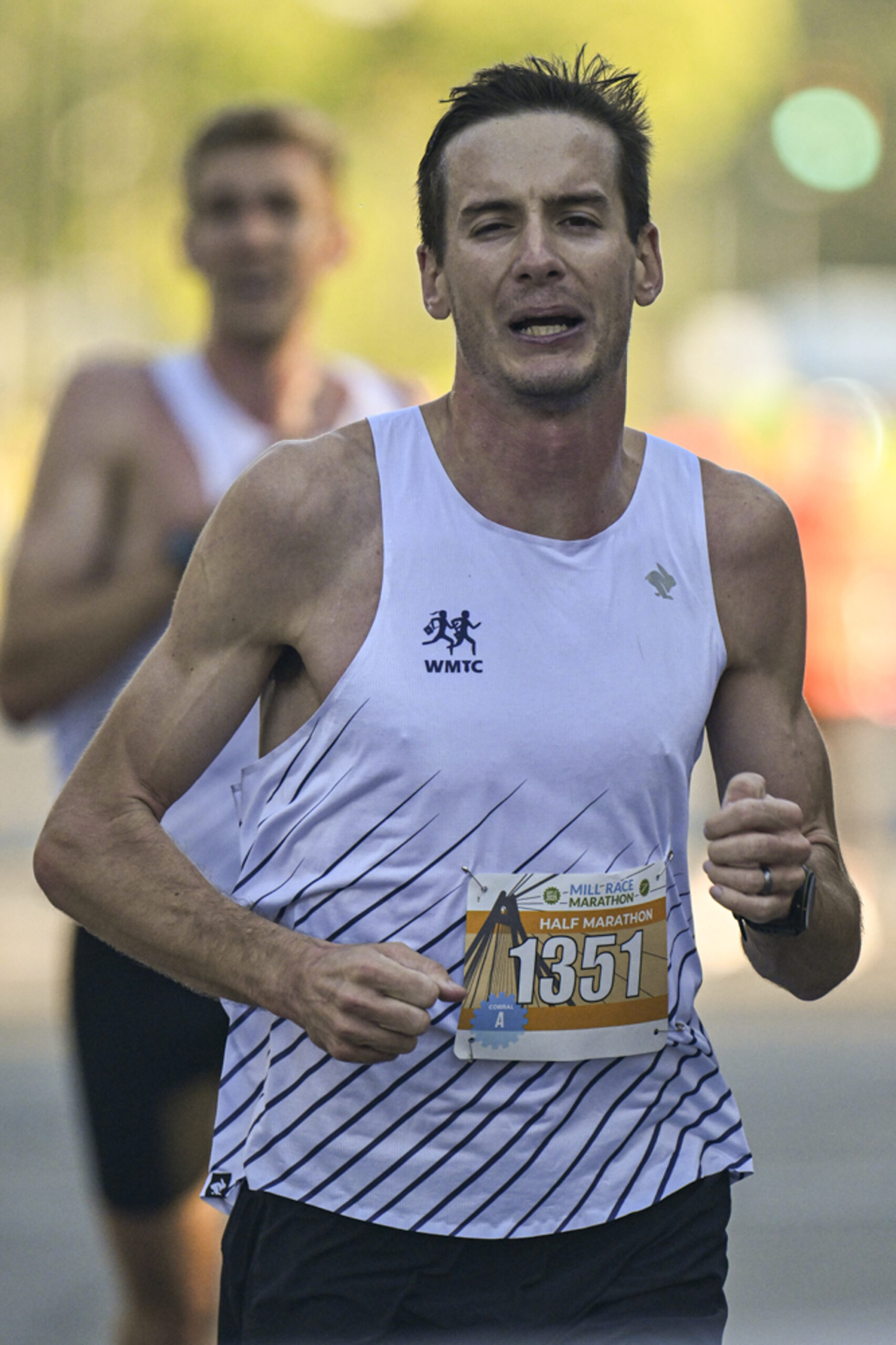 2025 Mill Race Marathon, Half Marathon Men’s winner, Johnnie Guy closes in on the finish line.