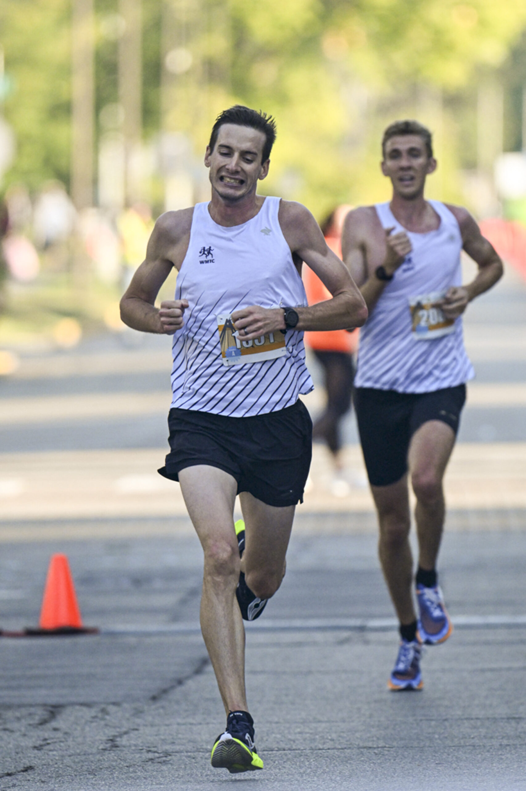2025 Mill Race Marathon, Half Marathon Men’s 3rd place finisher, Charles Parrish pushes for the finish line.