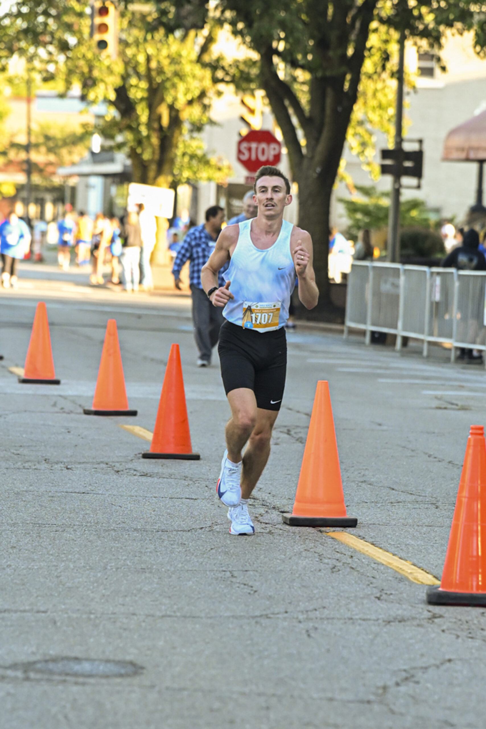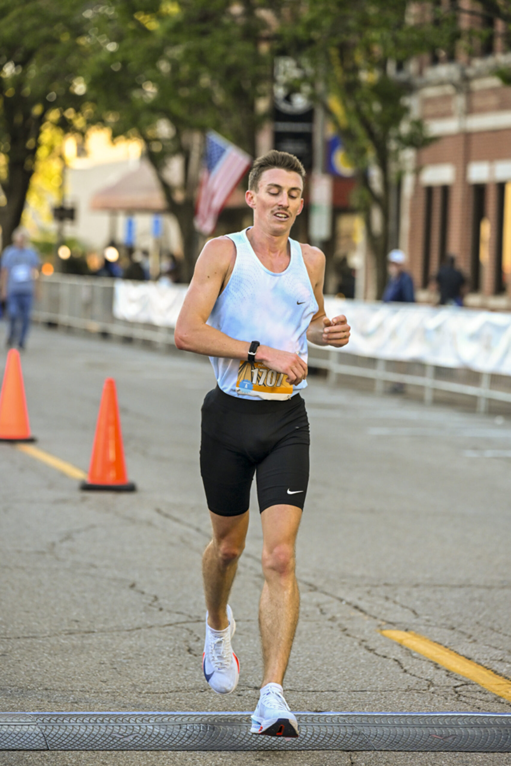 2025 Mill Race Marathon, Men’s winner, Jack Beakas makes the last turn for the finish line.