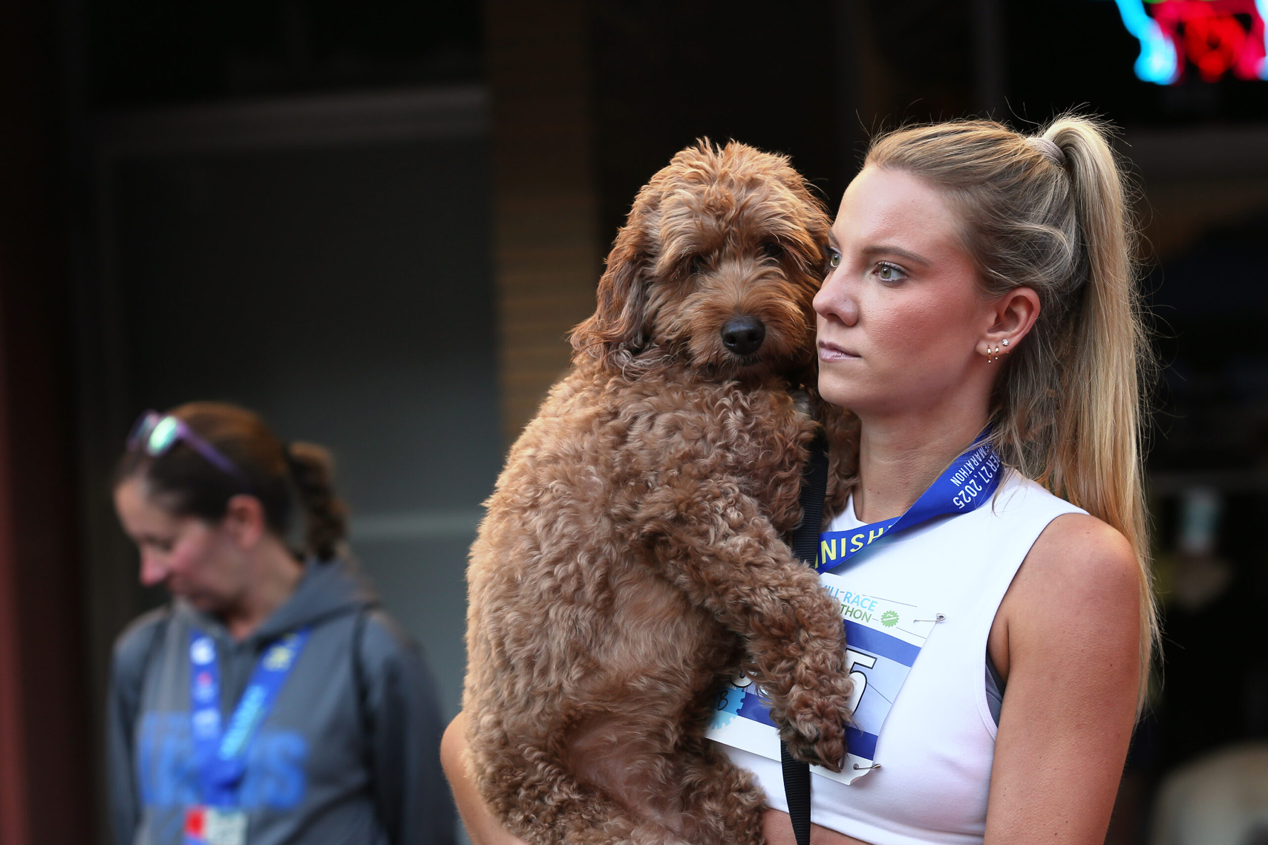 Tayler Chandler holding her dog Porter waits in line for a beverage from Lucabe during the Mill Race Marathon, Columbus, Ind., Saturday, September 27, 2025