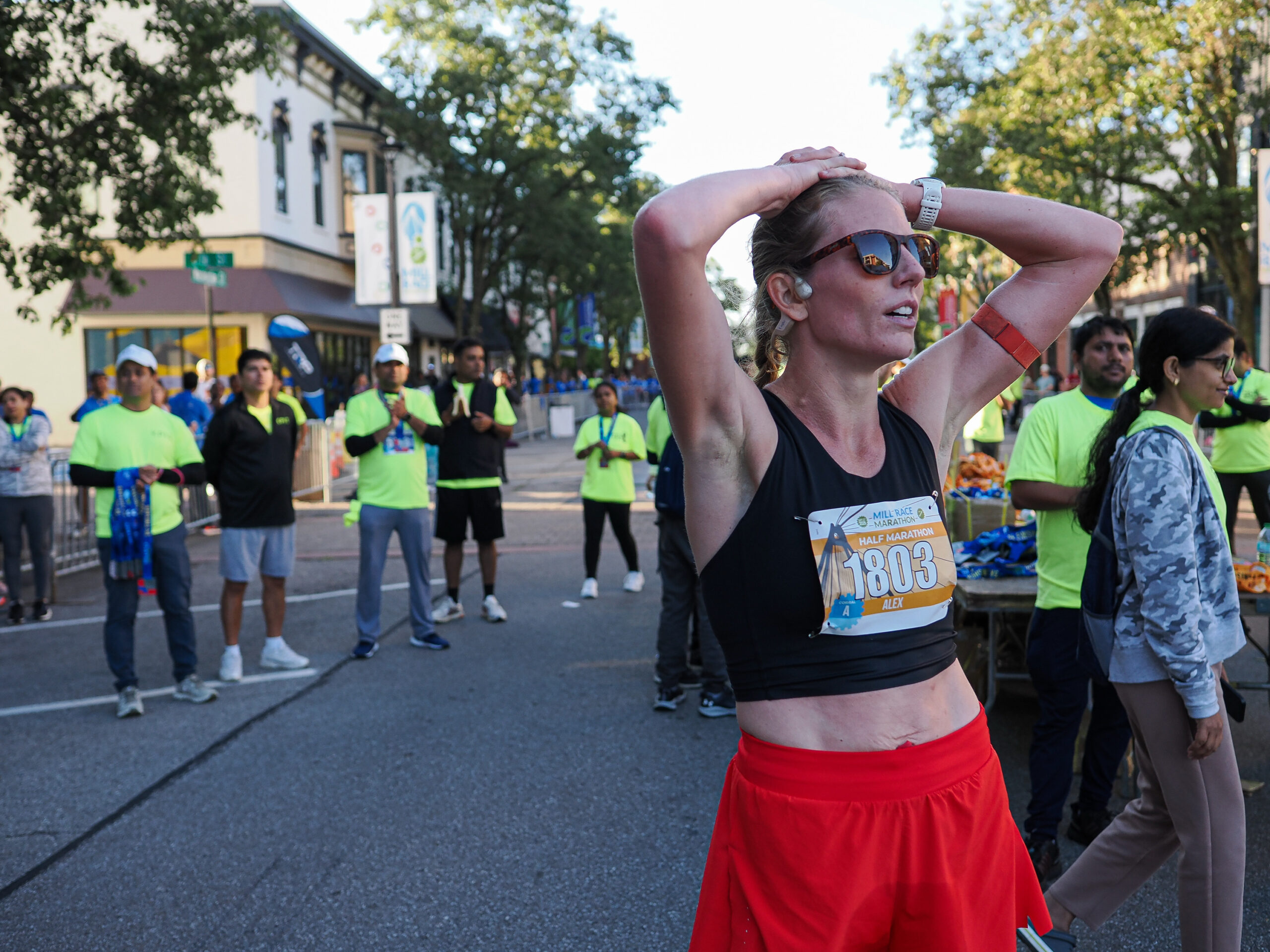 Alexandria Scearce catches her breath after finishing second in the women’s division of the half marathon portion of the Mill Race Marathon in downtown Columbus, Ind., Saturday, Sept. 27, 2025.