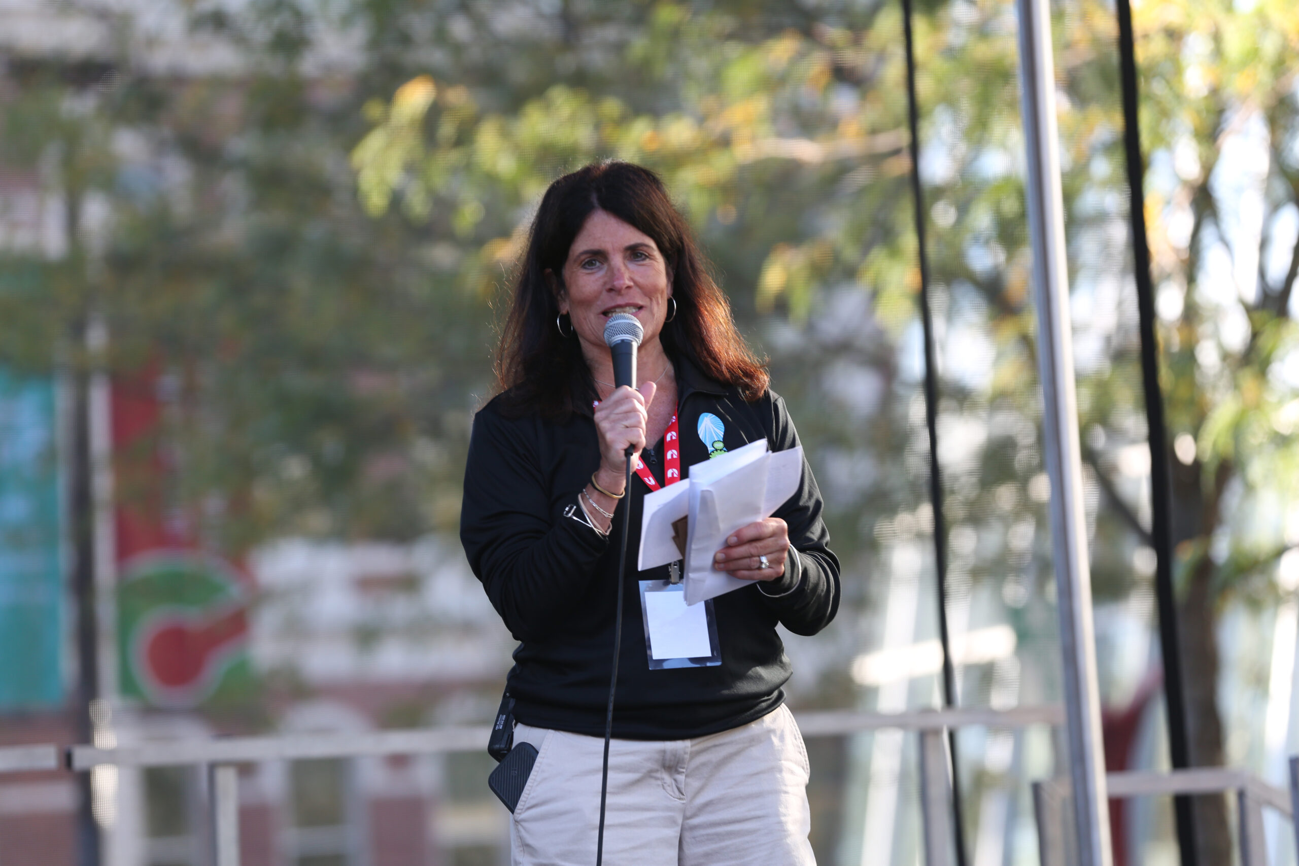 Laura Dudukovich welcomes people to the Mill Race Marathon in Columbus, Ind., Saturday, Sept. 27, 2025.