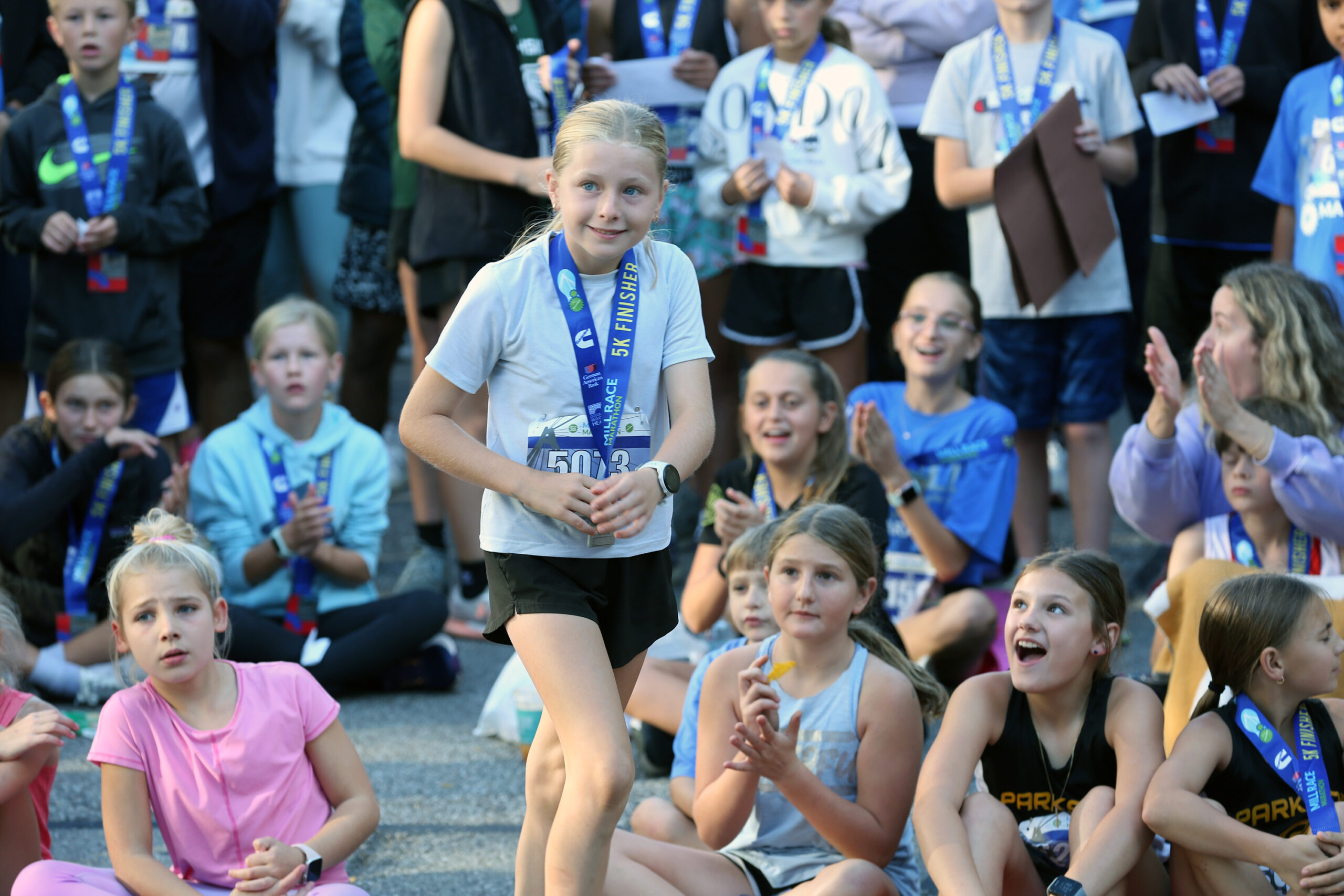 Isla Blackstock is cheered by her friends after winning one of the bicycles awarded in a drawing of finishers of the 5k during the Mill Race Marathon, Columbus, Ind. Saturday, September 27, 2025.