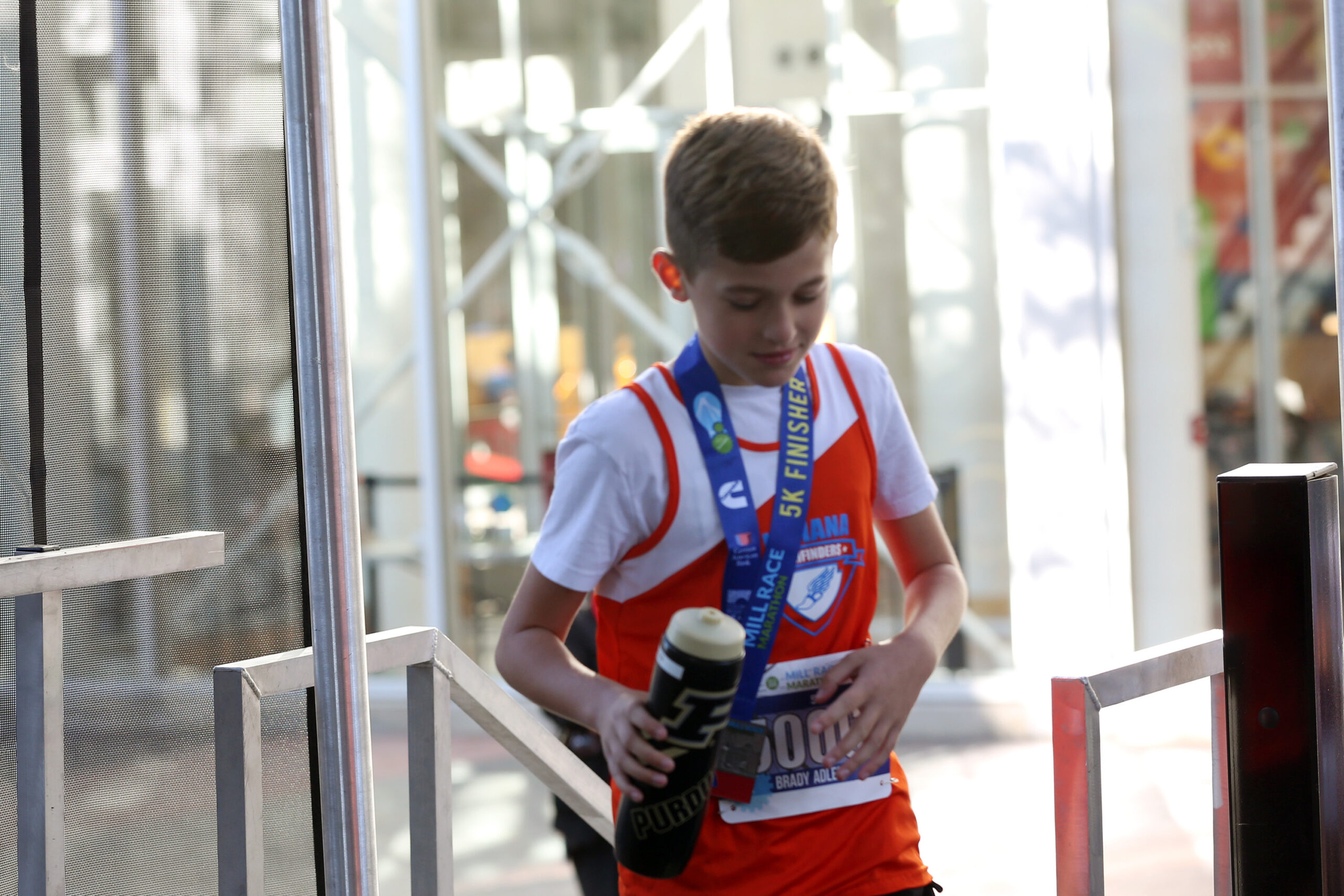 Brady Adler steps onto the stage after winning one of the bicycles awarded in a drawing of finishers of the 5k during the Mill Race Marathon, Columbus, Ind. Saturday, September 27, 2025.