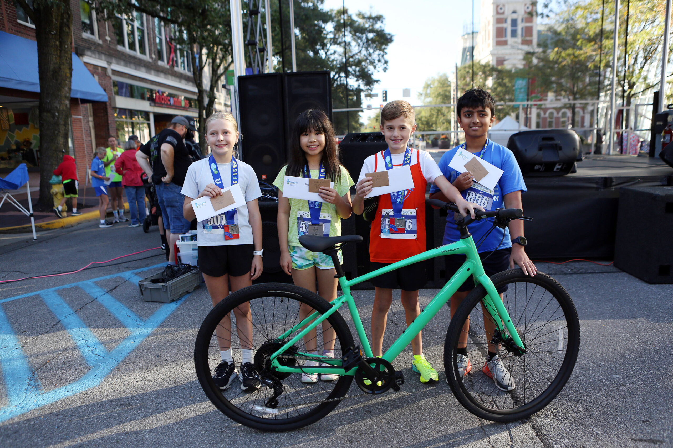 Isla Blackstock, at left, Rachel Chan, Brady Adler, and Ojas Utkur winners of the bicycles awarded in a drawing of finishers of the 5k during the Mill Race Marathon, Columbus, Ind. Saturday, September 27, 2025.