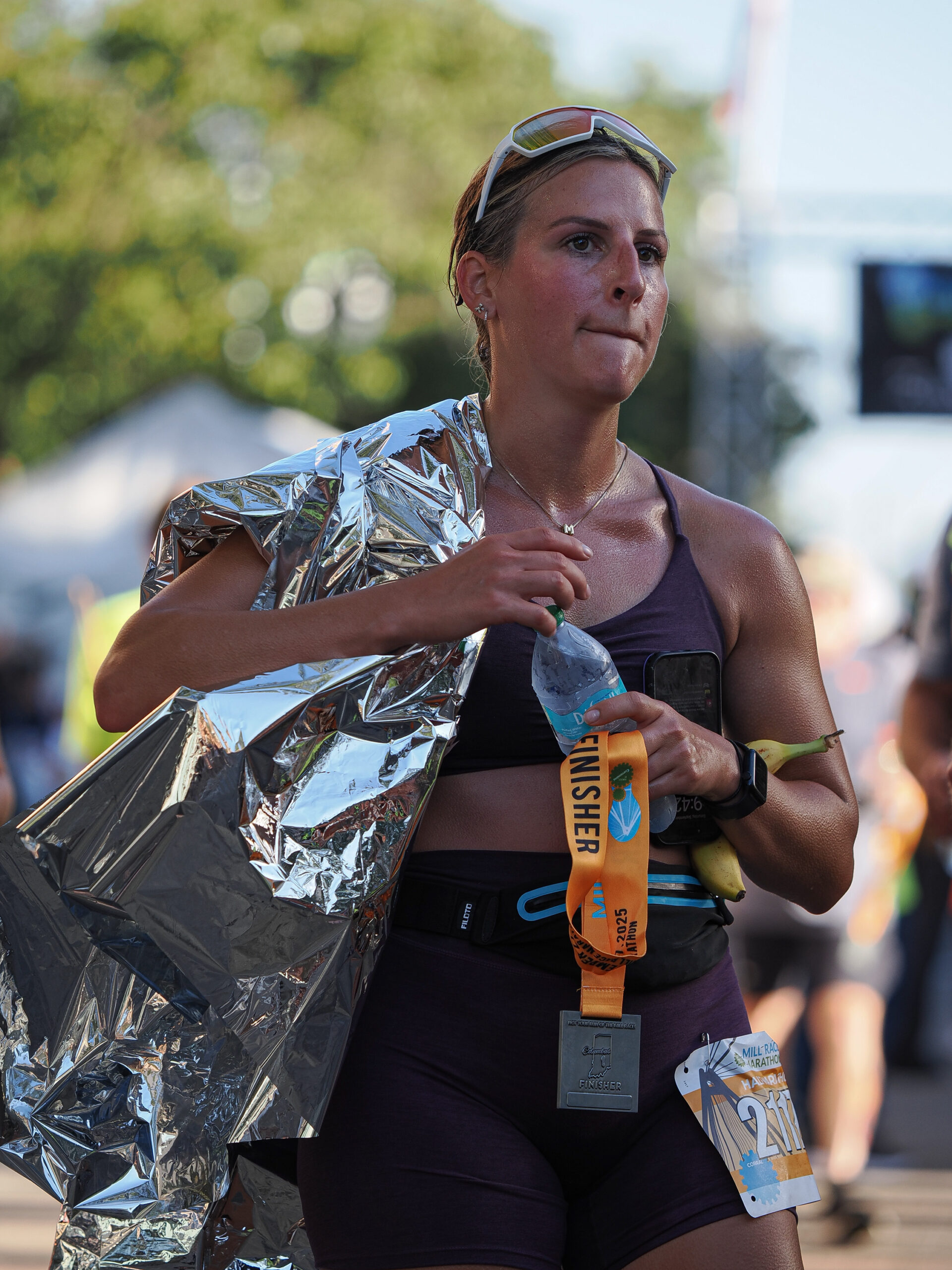Meghan Macy, of Columbus, wears a thermal blanket after completing the half marathon portion of the Mill Race Marathon in downtown Columbus, Ind., Sept. 27, 2025.