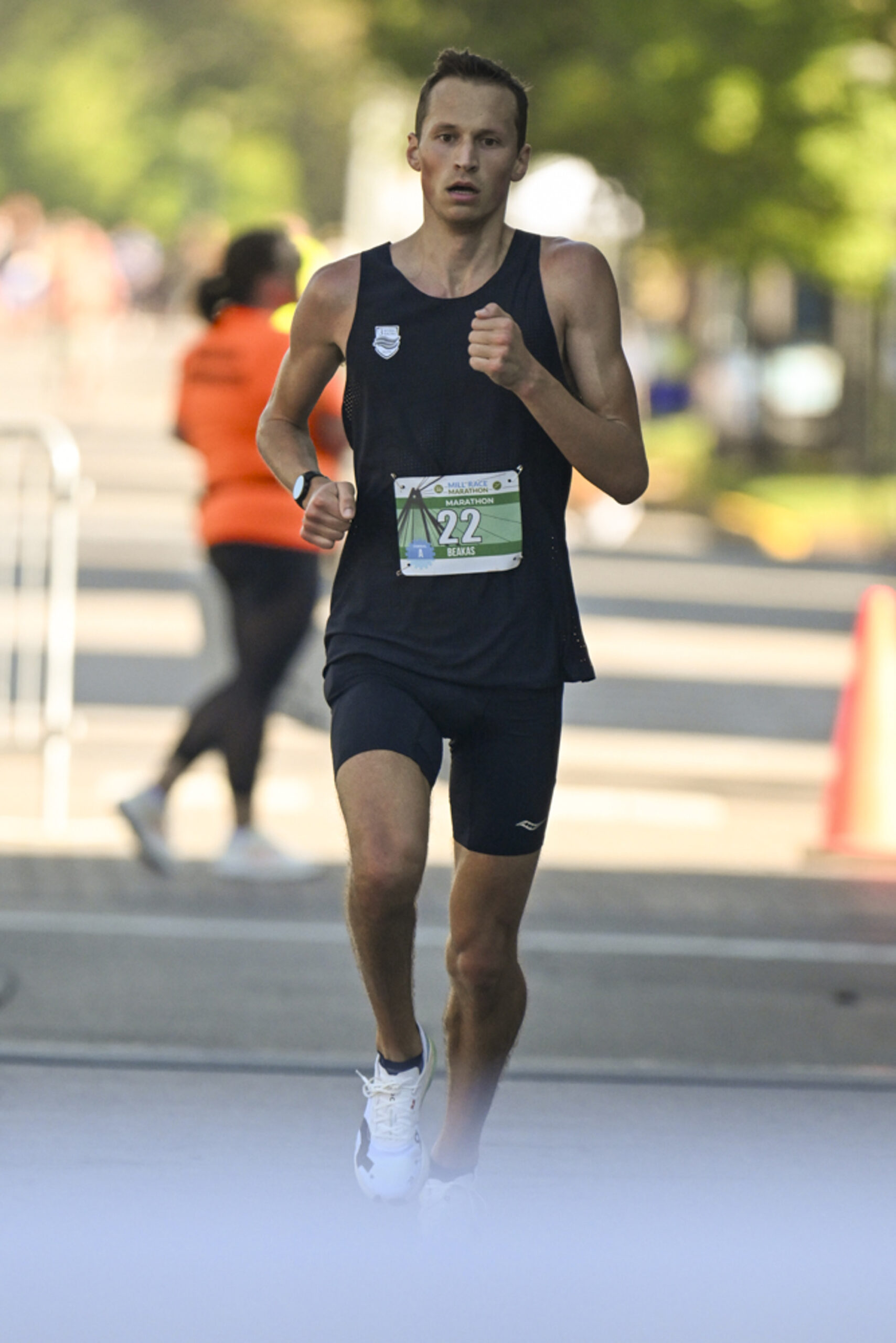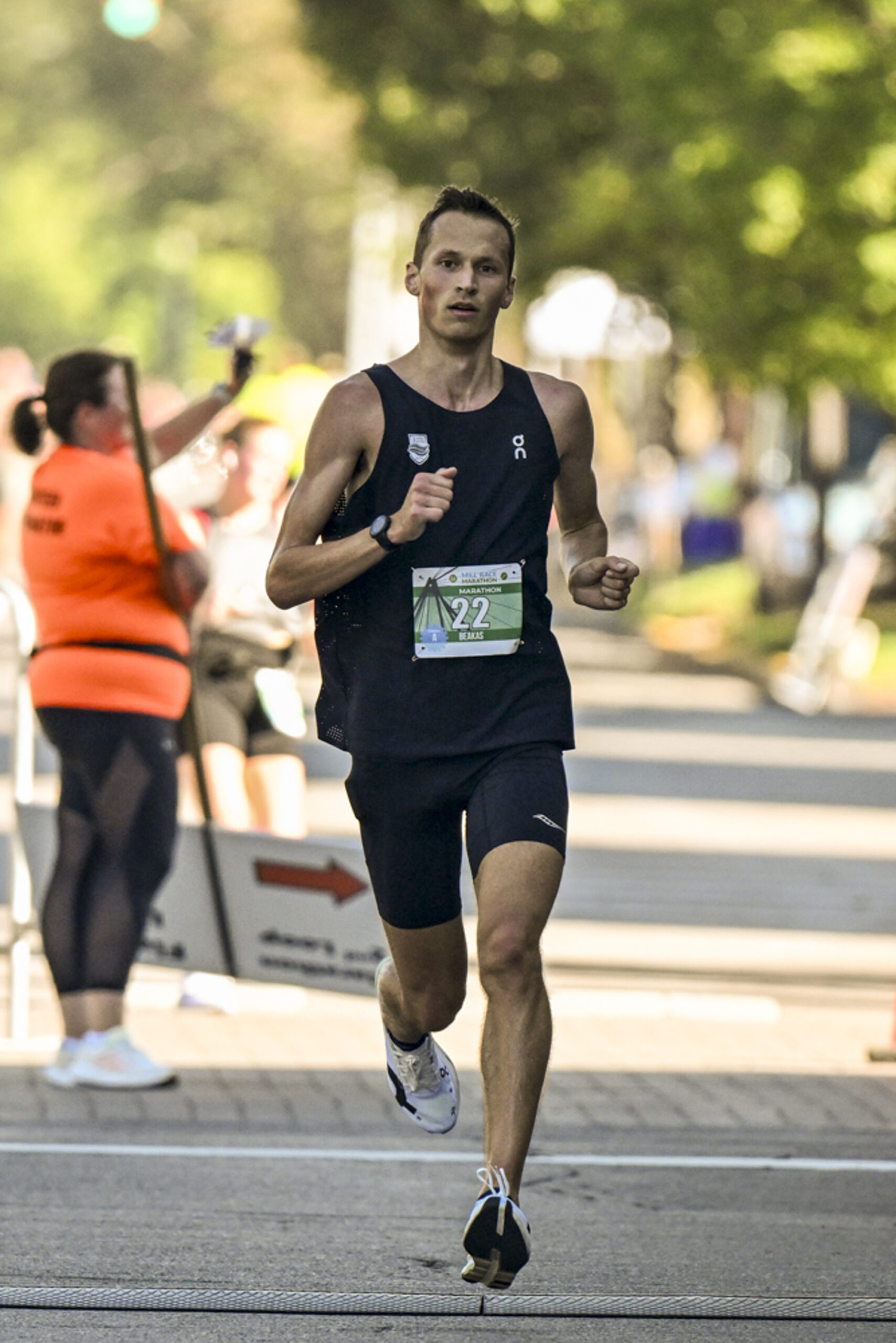 2025 Mill Race Marathon, Men’s winner, Jack Beakas in the final stretch for the finish line.