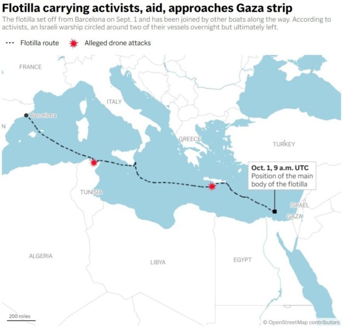 The Global Sumud Flotilla, with Greta Thunberg, Nelson Mandela’s grandson, Mandla Mandela, and several European lawmakers aboard, consists of nearly 50 boats and 500 activists and is carrying a symbolic amount of humanitarian aid. It has remained undeterred in its mission to break the Israeli blockade of the coastal strip and reach Palestinians.
