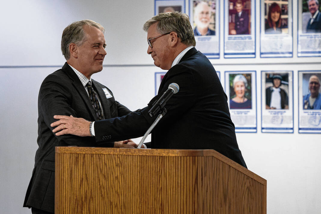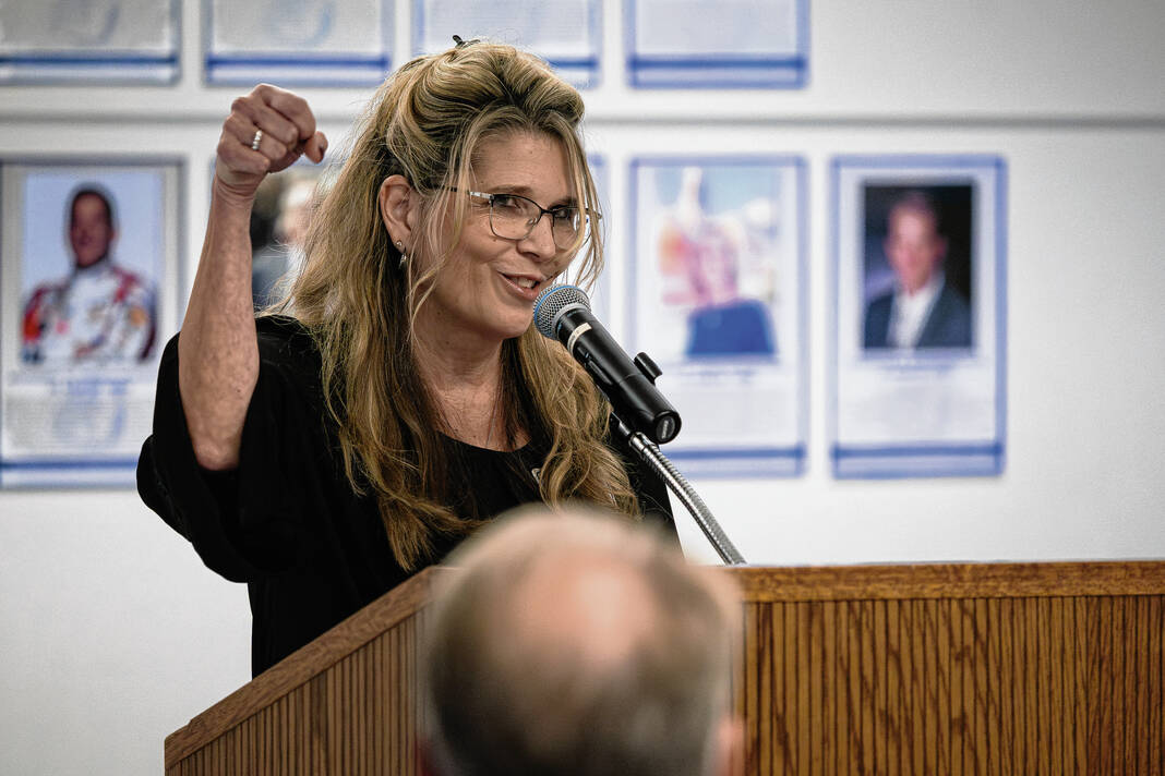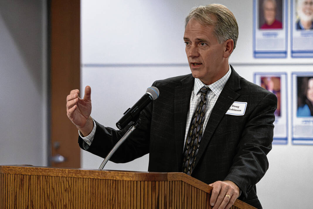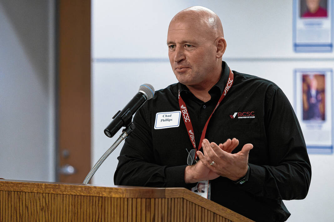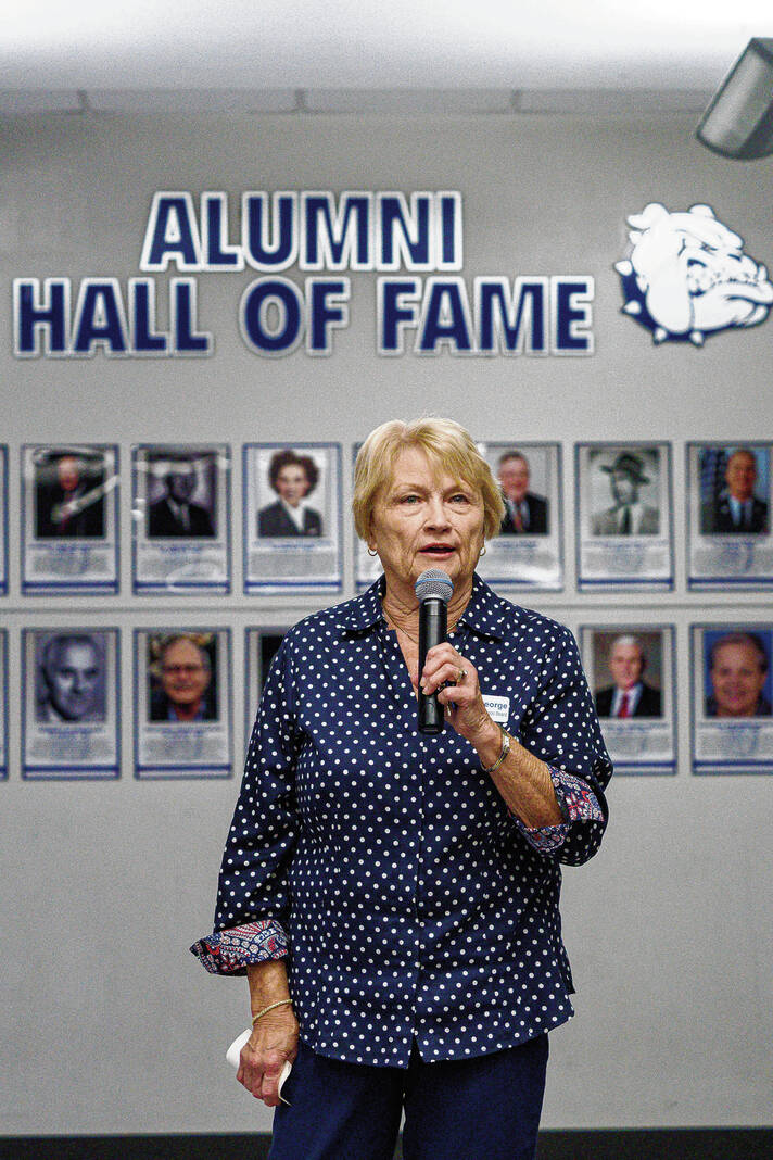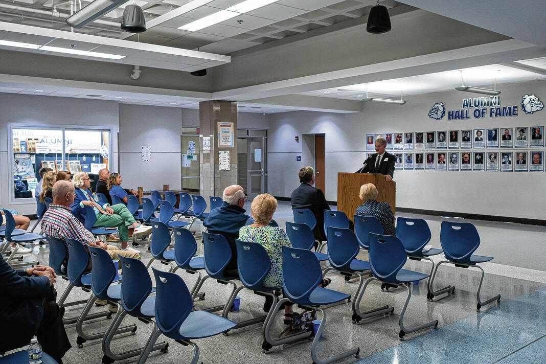 Mike Wolanin | The Republic Donald Robinson, 2025 Bull Dog Alumni Association Hall of Fame inductee, give a speech during the alumni association’s annual hall of fame induction ceremony at Columbus North High School in Columbus, Ind., Friday, Oct. 3, 2025.