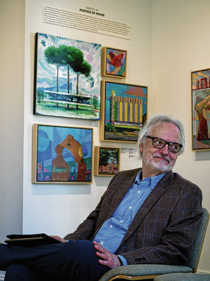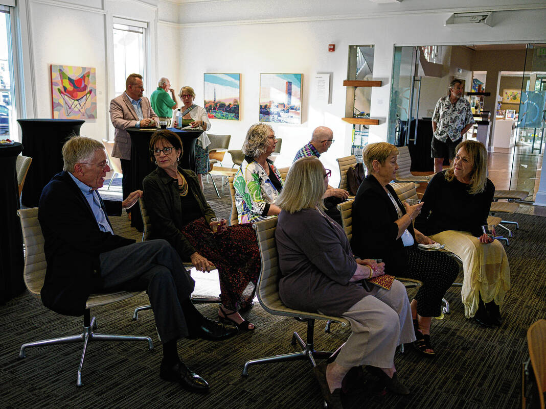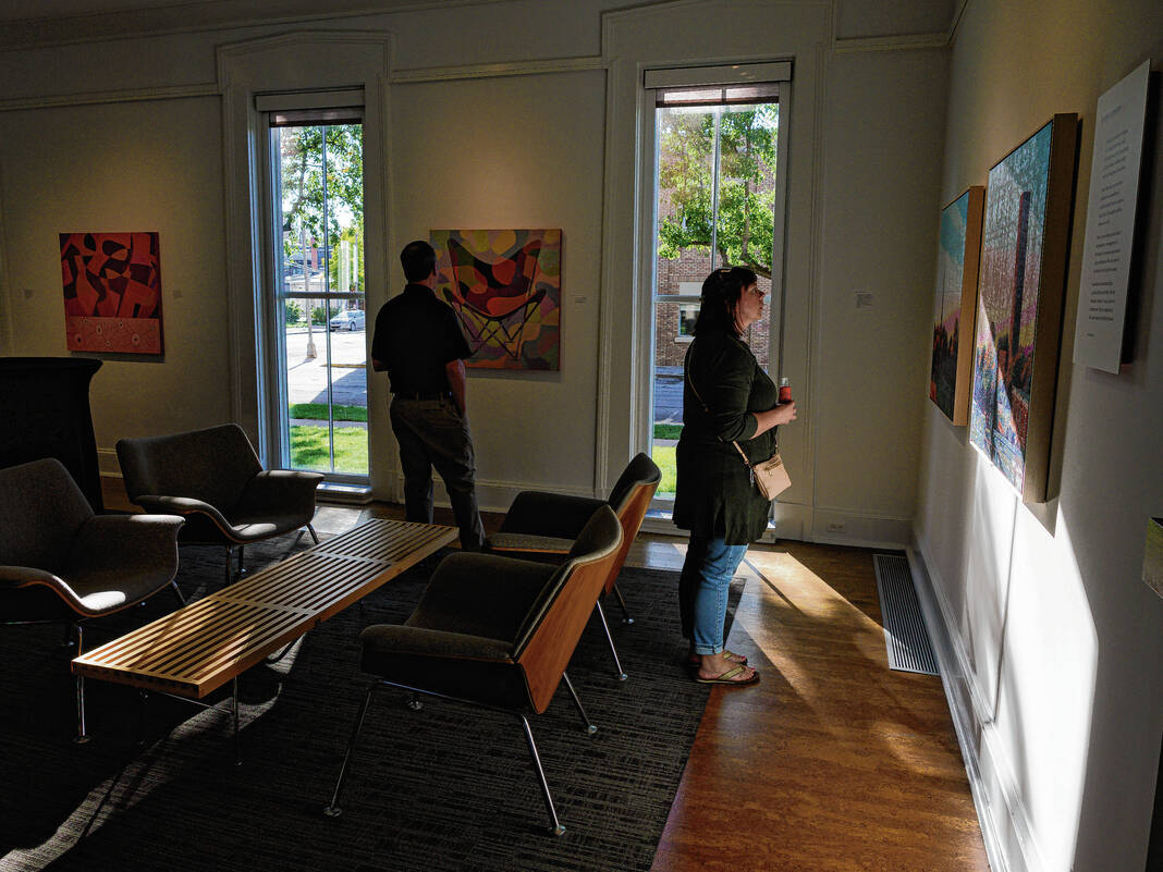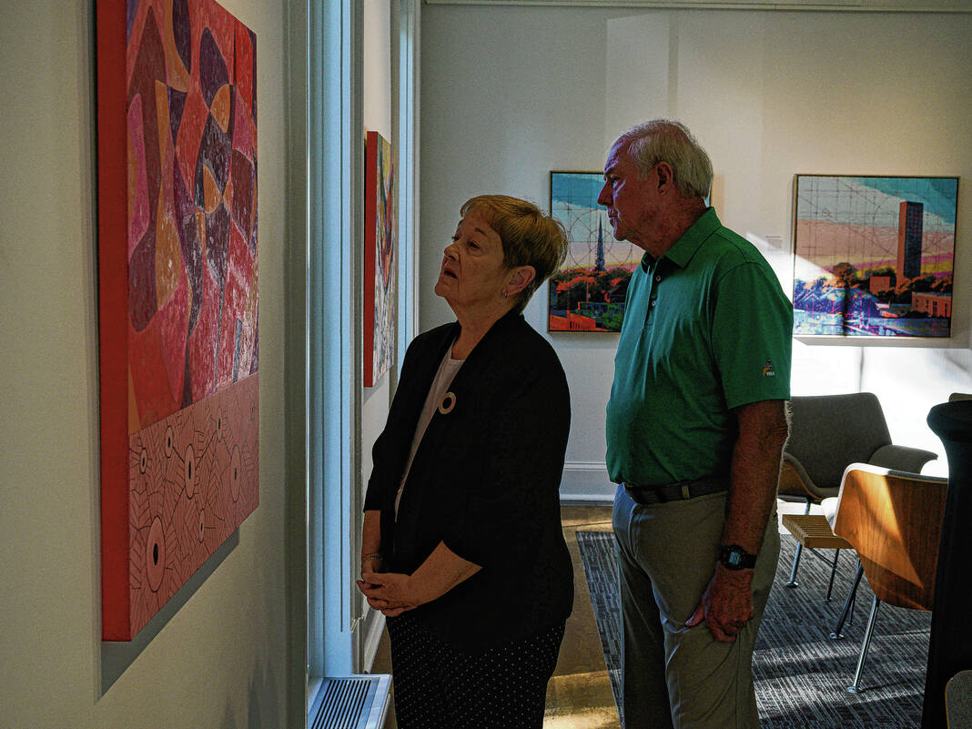 Mike Wolanin | The Republic Guests look at an abstract painting by artist Lloyd Brooks fothe Saarinen alpahbet reception for an exhibit by Brooks and author Skip Berry at the Columbus Area Visitors Center in Columbus, Ind., Tuesday, Sept. 30, 2025. The exhibit titled Poetics of Space - Living with Modernism features paintings by Brooks of modernist architecture around Columbus as well as abstract paintings of the modernist movement and poems by Berry.