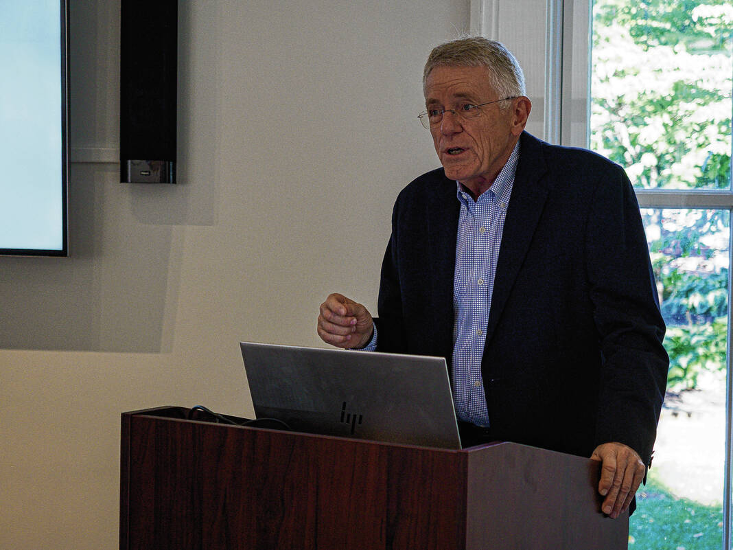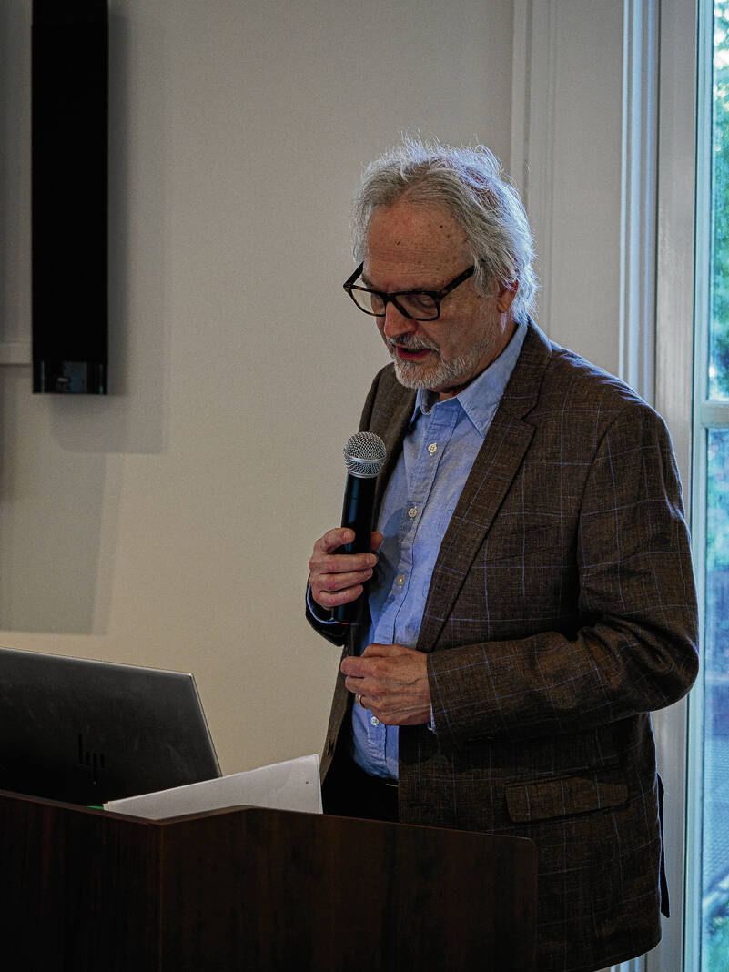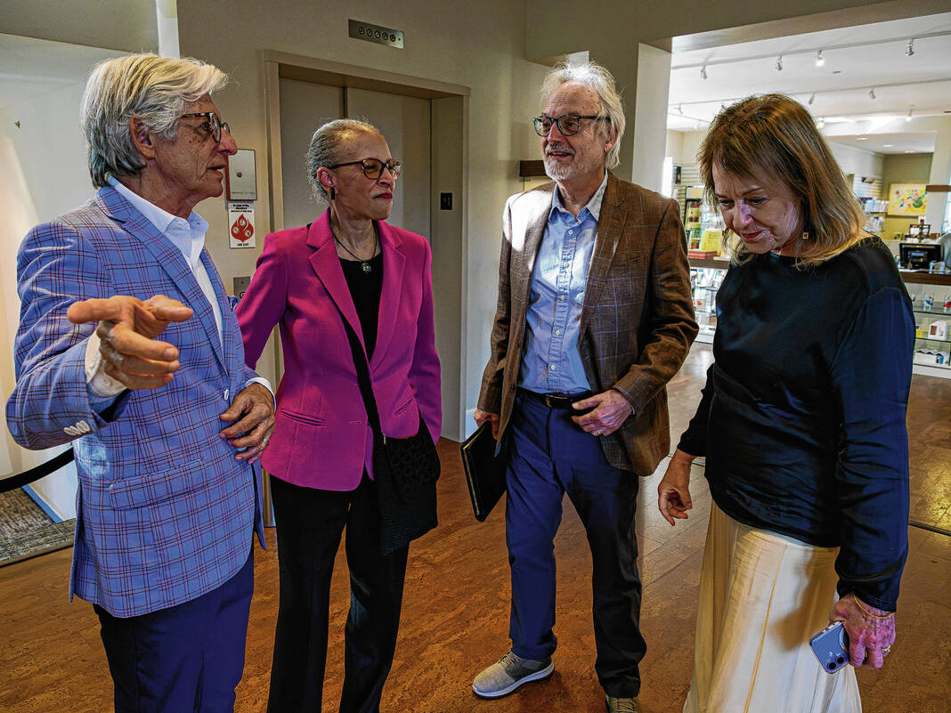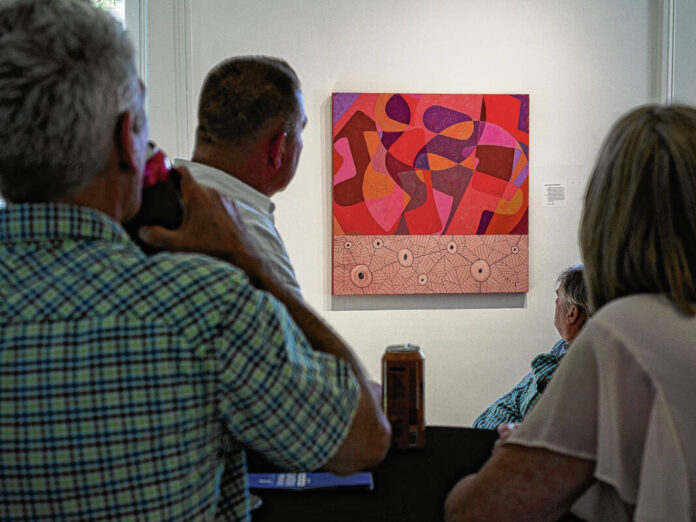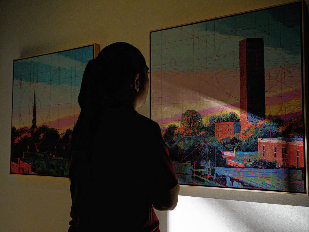 Mike Wolanin | The Republic Guests look at an abstract painting by artist Lloyd Brooks fothe Saarinen alpahbet reception for an exhibit by Brooks and author Skip Berry at the Columbus Area Visitors Center in Columbus, Ind., Tuesday, Sept. 30, 2025. The exhibit titled Poetics of Space - Living with Modernism features paintings by Brooks of modernist architecture around Columbus as well as abstract paintings of the modernist movement and poems by Berry.