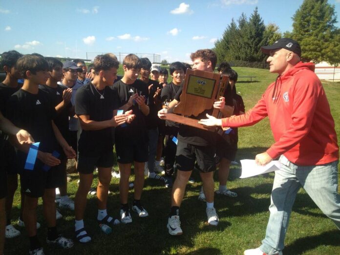 Columbus North’s Teddy Littrell accepts the semistate trophy from Center Grove athletics director Joe Bronkella following Saturday’s 3-2 win against Cathedral.