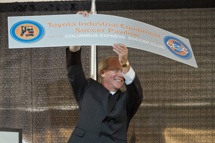 Brett Wood, the CEO for Toyota Material Handling North America, holds a sign bearing the name of a new indoor soccer complex for Columbus during a 25-year anniversary party for the Toyota Industrial Equipment Manufacturing (TIEM) facility on Oct. 15, 2015.