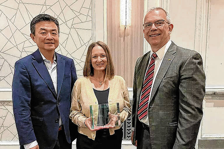 Photo provided CAEP President Chris Koch, right, and Board Chair Yuhang Rong, left, present the 2025 Murray Award to IU Columbus Professor A’ame Joslin.