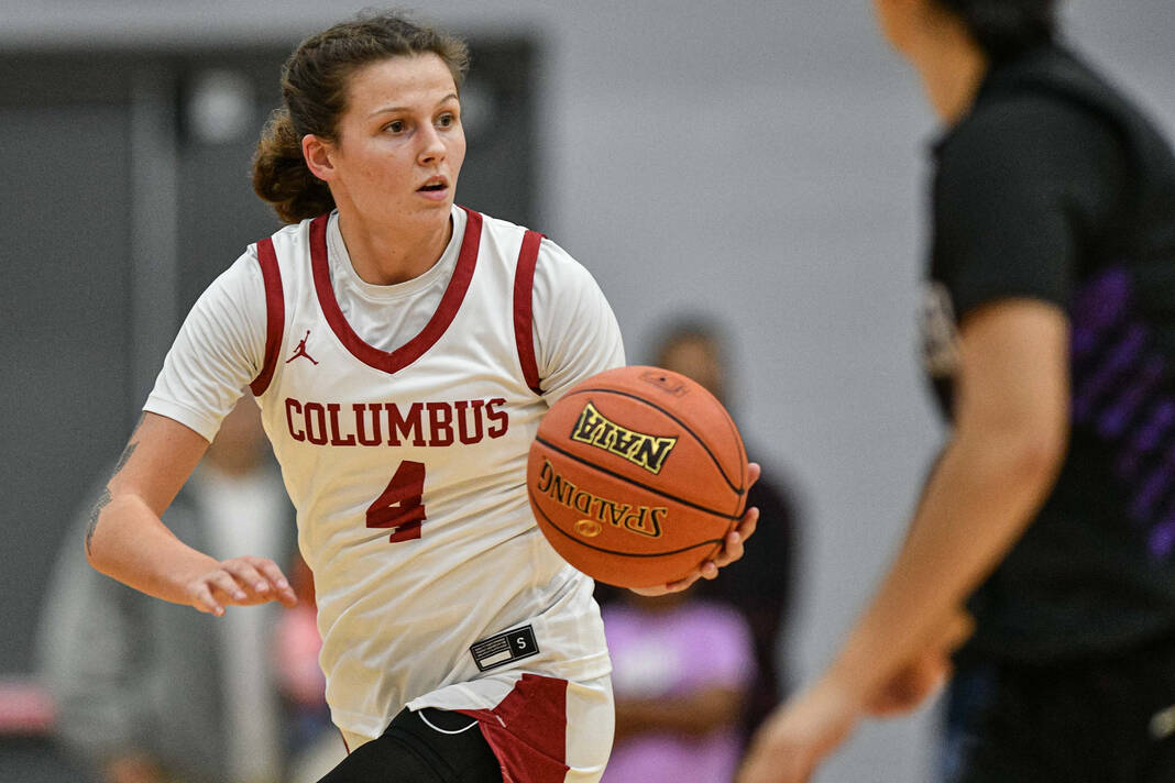 IU Columbus’ Abby Fleetwood dribbles up the court during the inaugural home game for the IU Columbus women’s basketball team against Kuyper College Nov. 14, 2024, at NexusPark.